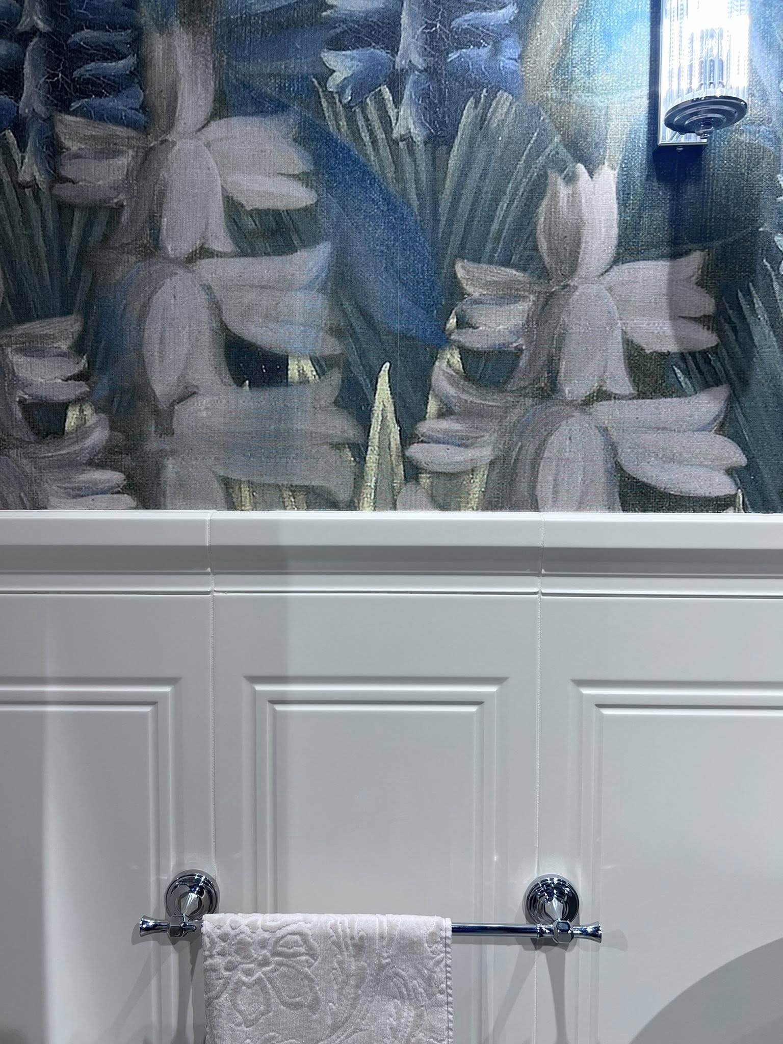 Boiserie in un bagno a Vicenza progettato da Giulia utilizzando delle piastrelle bianche opache, chiusura superiore con terminale squadrato e una pittura decorata fino a soffitto.