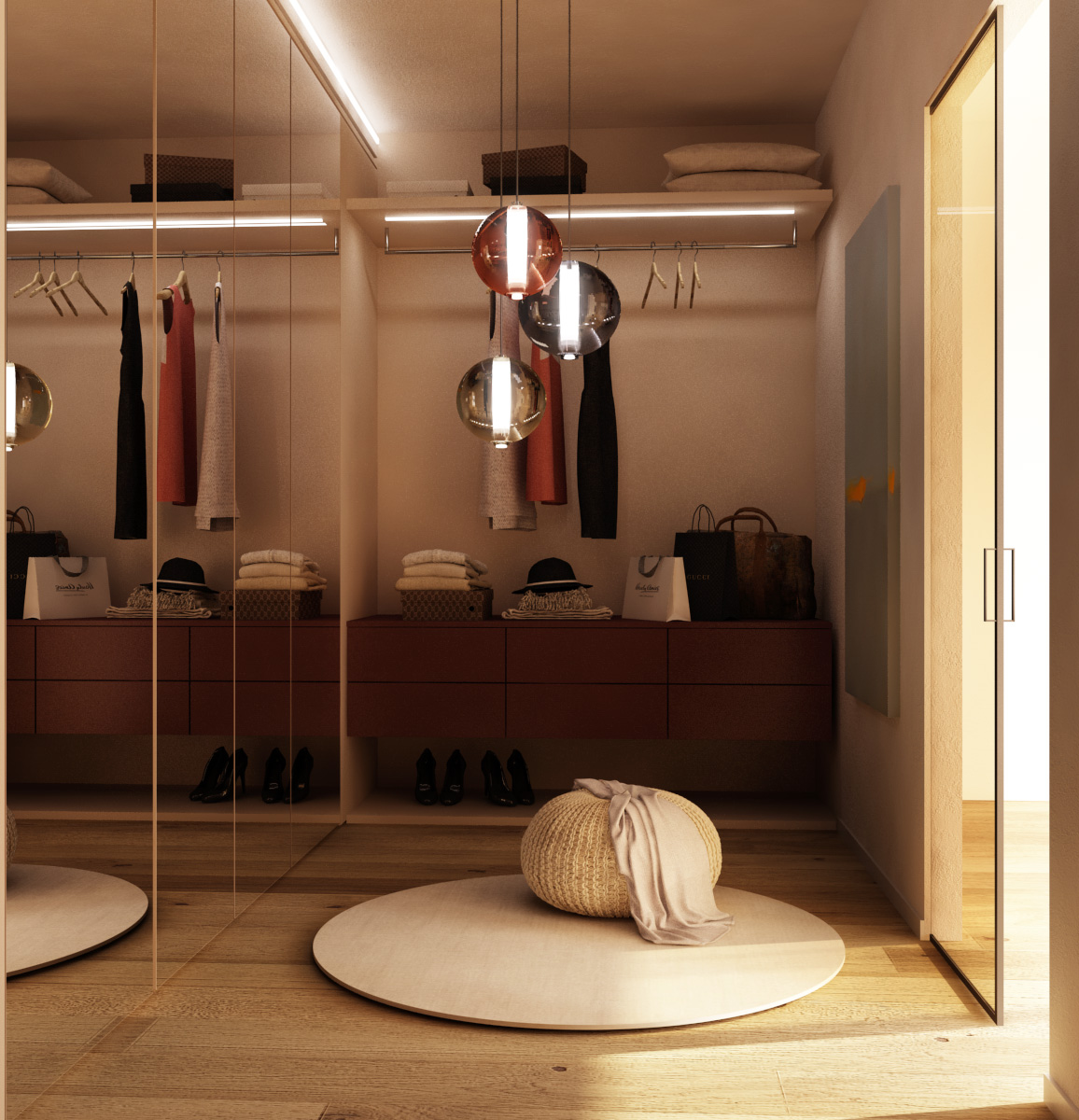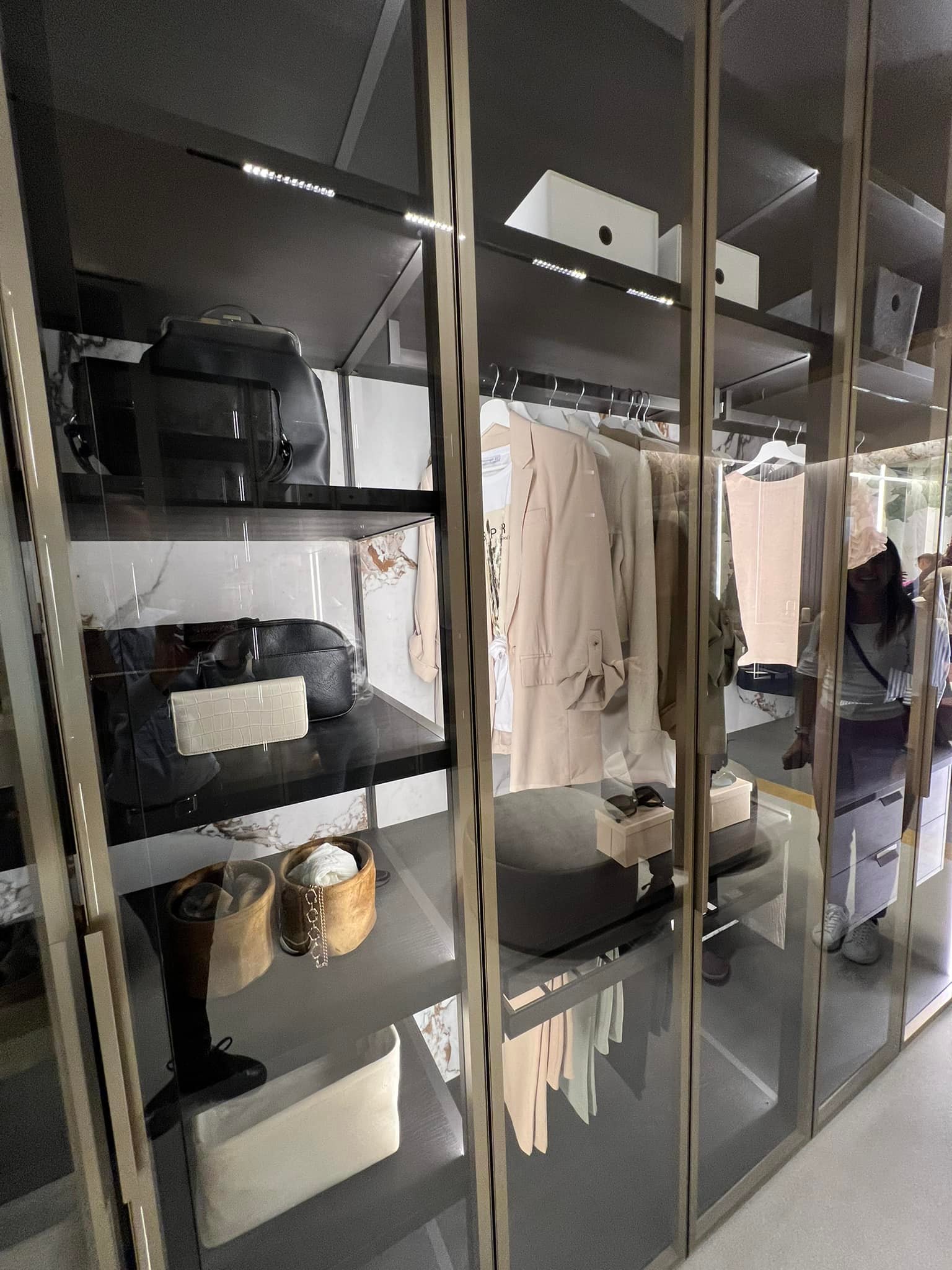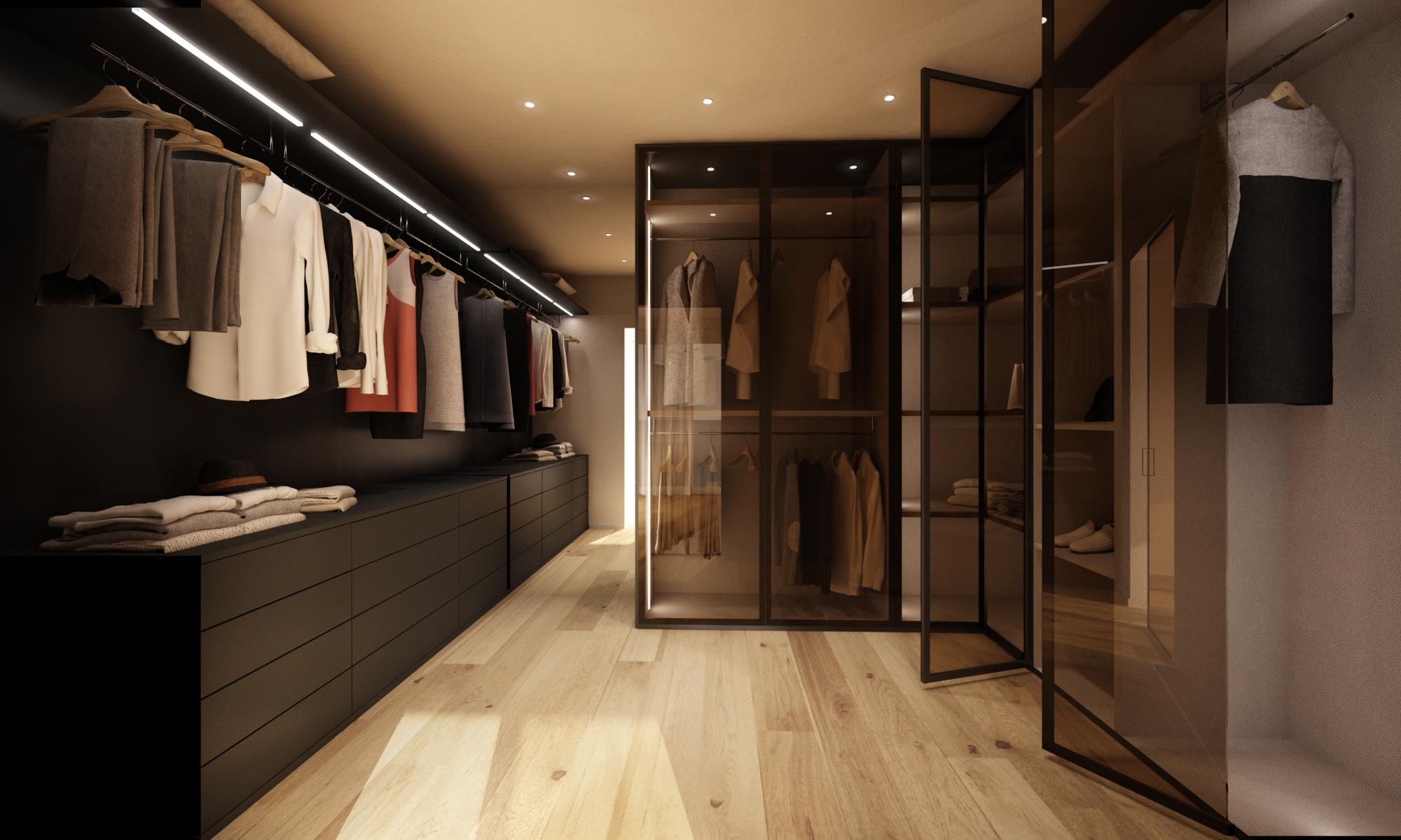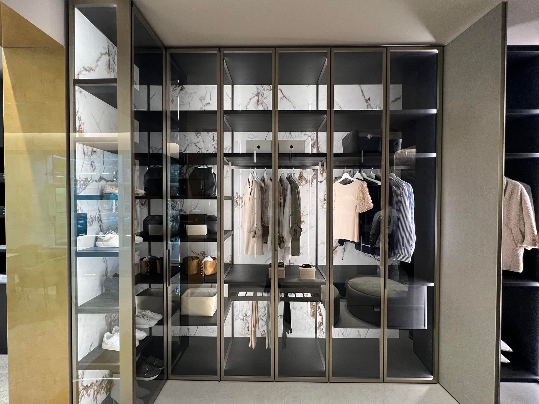 È fondamentale che lo spazio consenta almeno una persona in piedi al centro, con libertà di movimento per accedere comodamente agli indumenti.