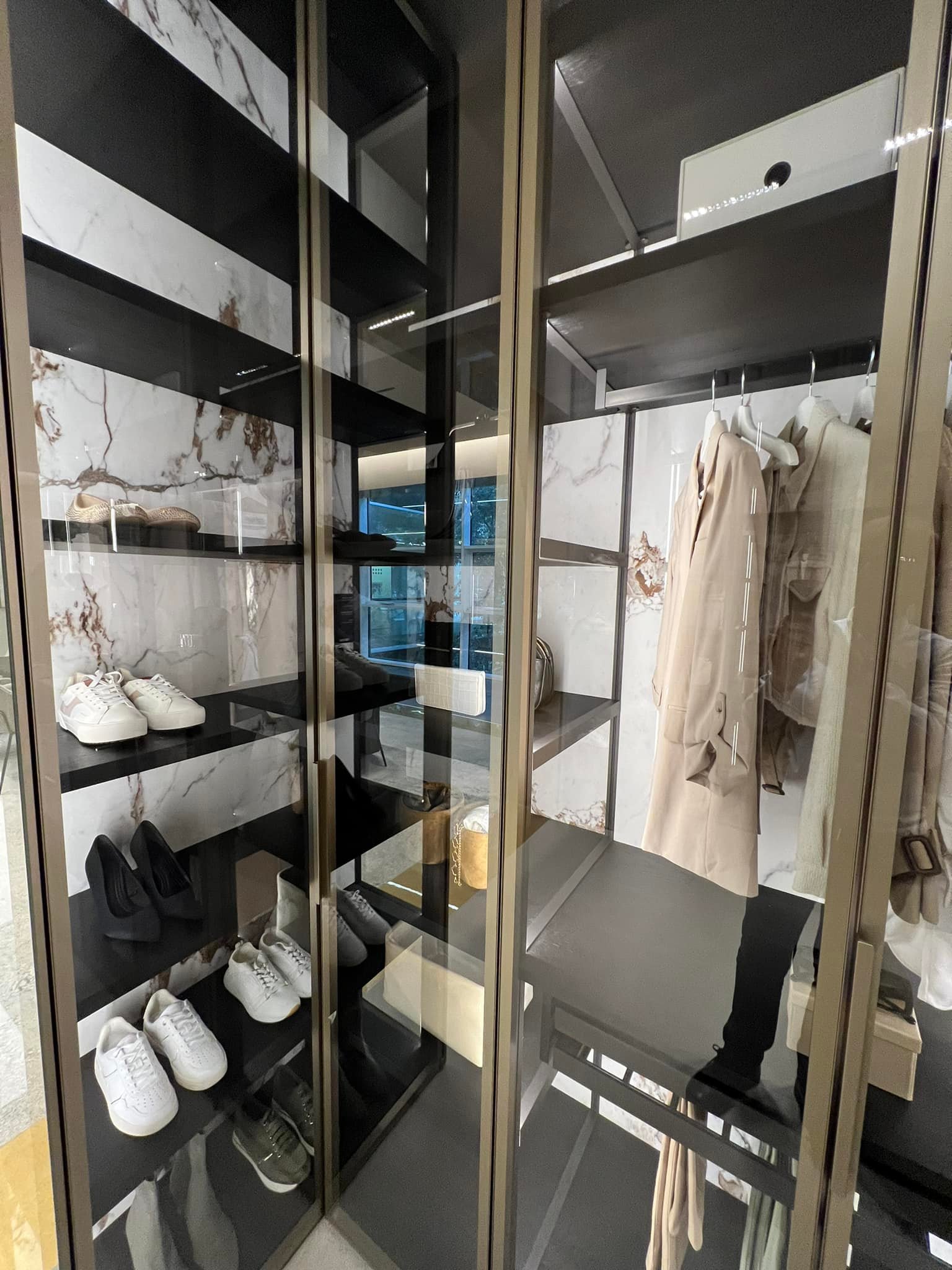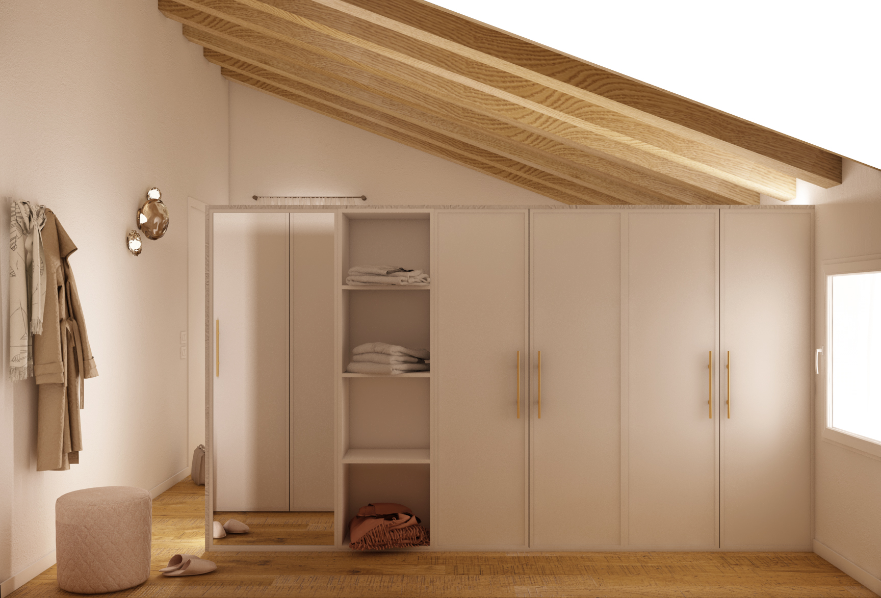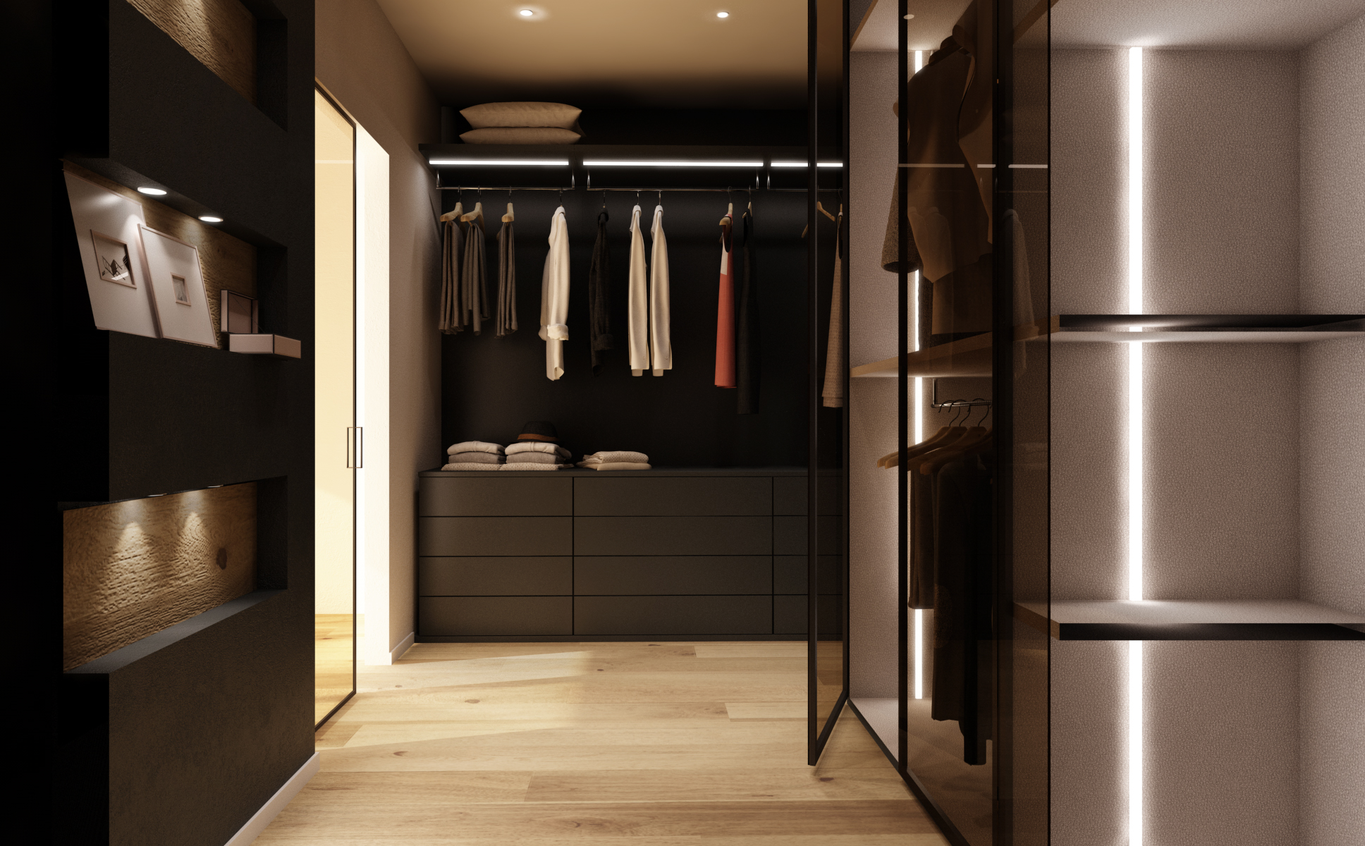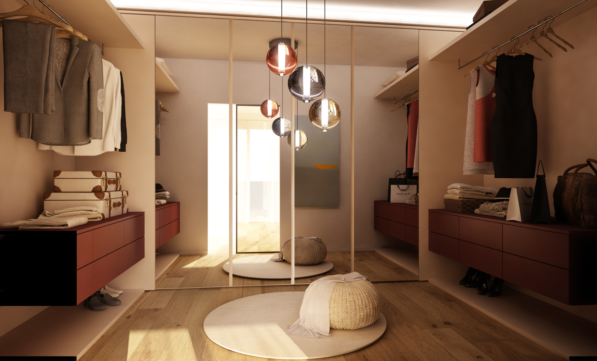 È fondamentale che lo spazio consenta almeno una persona in piedi al centro, con libertà di movimento per accedere comodamente agli indumenti.
