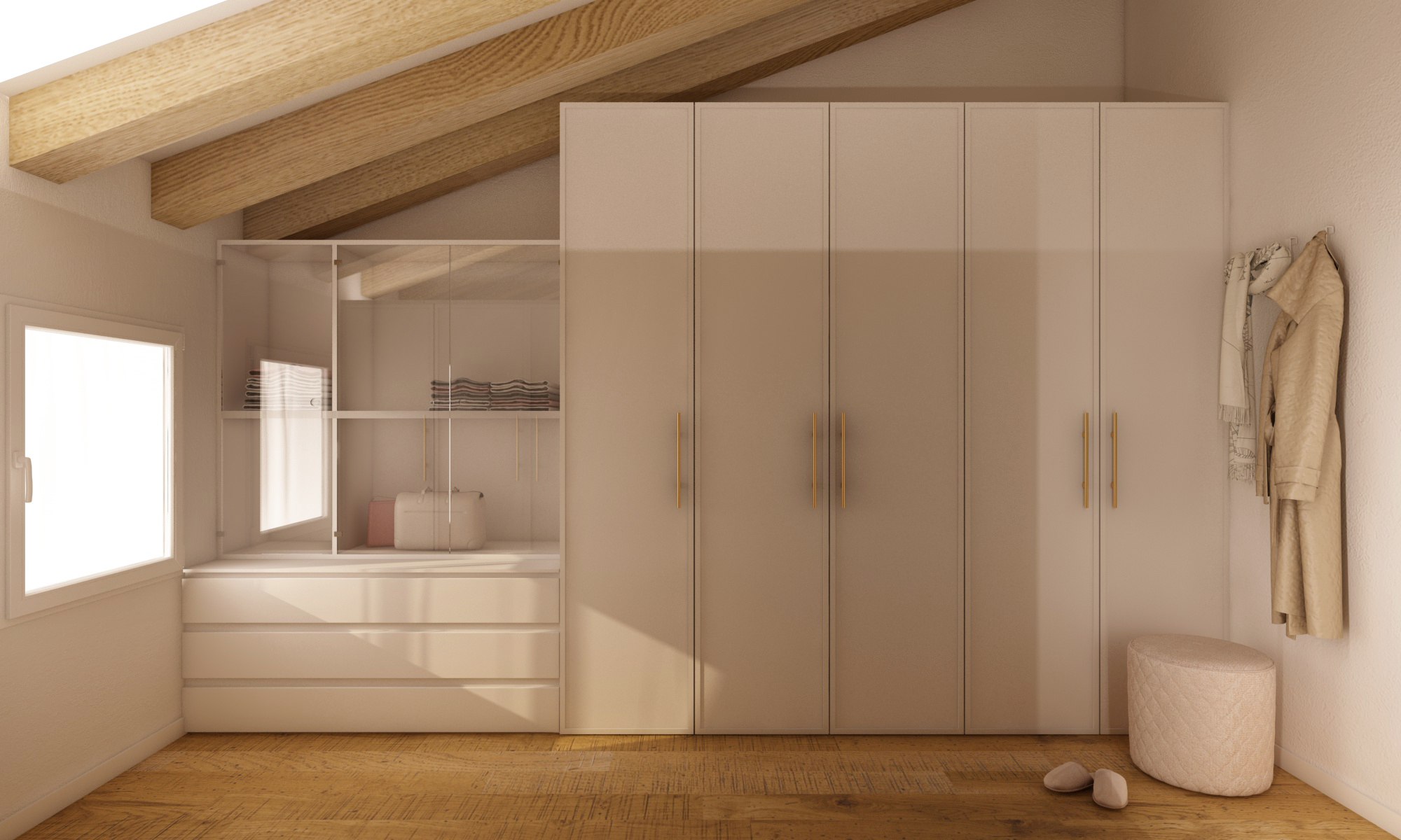 - Cassetti bassi sotto l’appendiabiti per biancheria e accessori