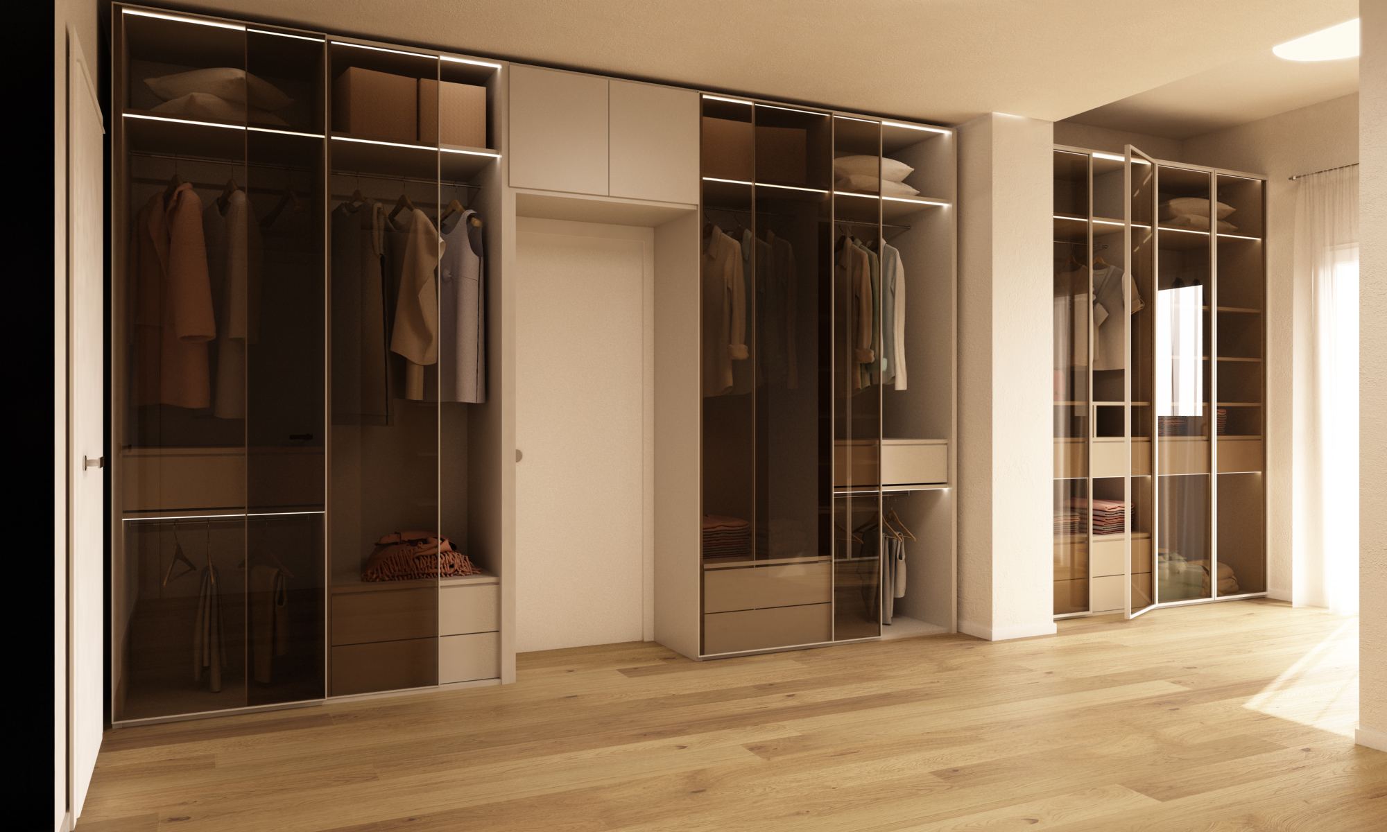 - Ante scorrevoli in vetro satinato o specchiato per riflettere la luce