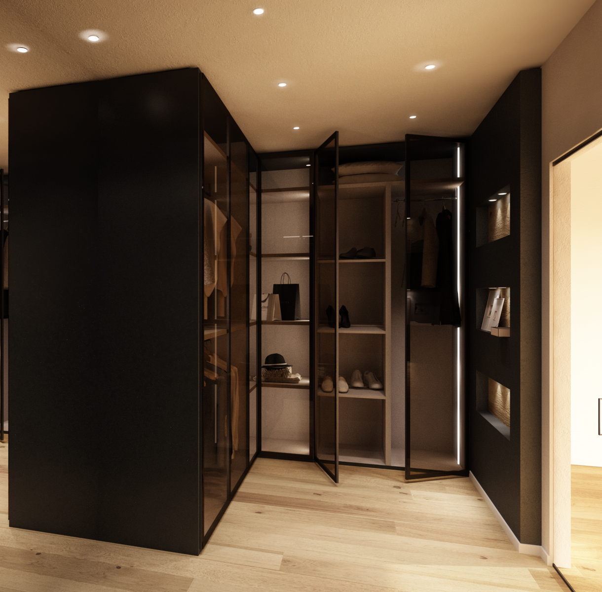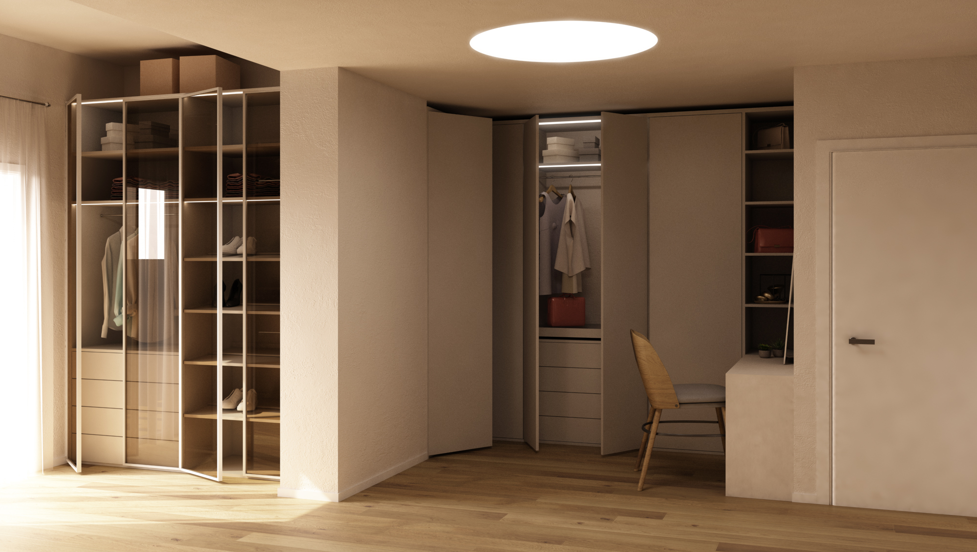 In spazi contenuti, quasi sempre consigliamo la cabina aperta, senza ante, per evitare l’ingombro delle aperture e favorire la sensazione di leggerezza. Tuttavia, se si vuole preservare l’ordine visivo, le ante scorrevoli o le tende possono aiutare.