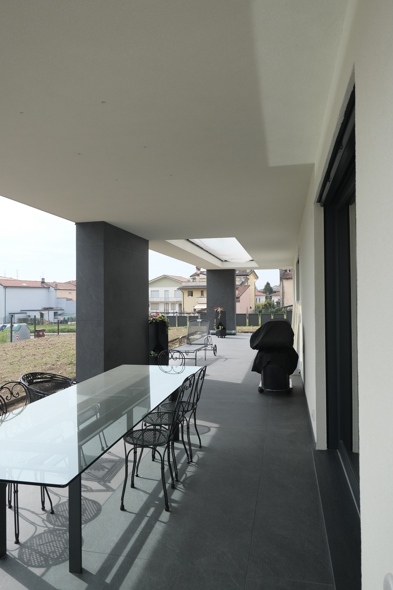 Il pavimento esterno che riveste il vialetto pedonale d’ingresso e il patio laterale di questa casa moderna è realizzato con grandi lastre in gres effetto porfido, una scelta che unisce estetica naturale e prestazioni tecniche di alto livello. Questo gres riproduce fedelmente l’aspetto del porfido, una pietra vulcanica caratterizzata da una texture ricca e variegata, con tonalità che spaziano dai grigi scuri passando per sfumature di marrone e beige. Le grandi lastre, posate con precisione, presentano una superficie leggermente irregolare e materica, tipica del porfido naturale, ma con la praticità e la resistenza del gres porcellanato.