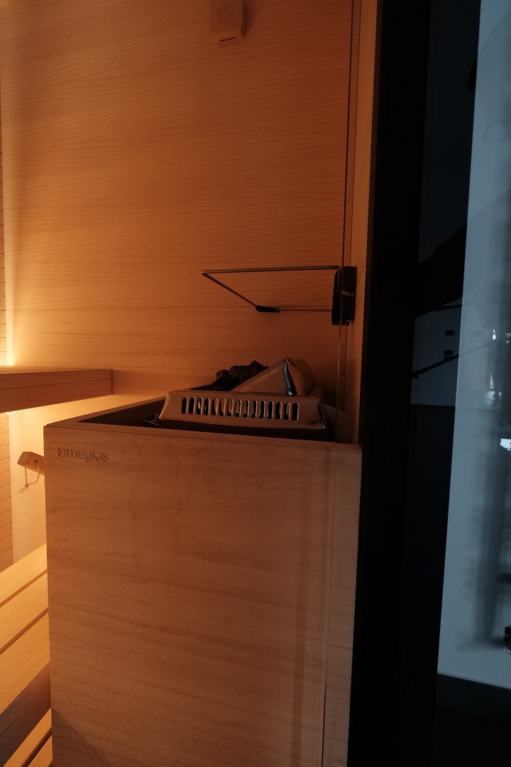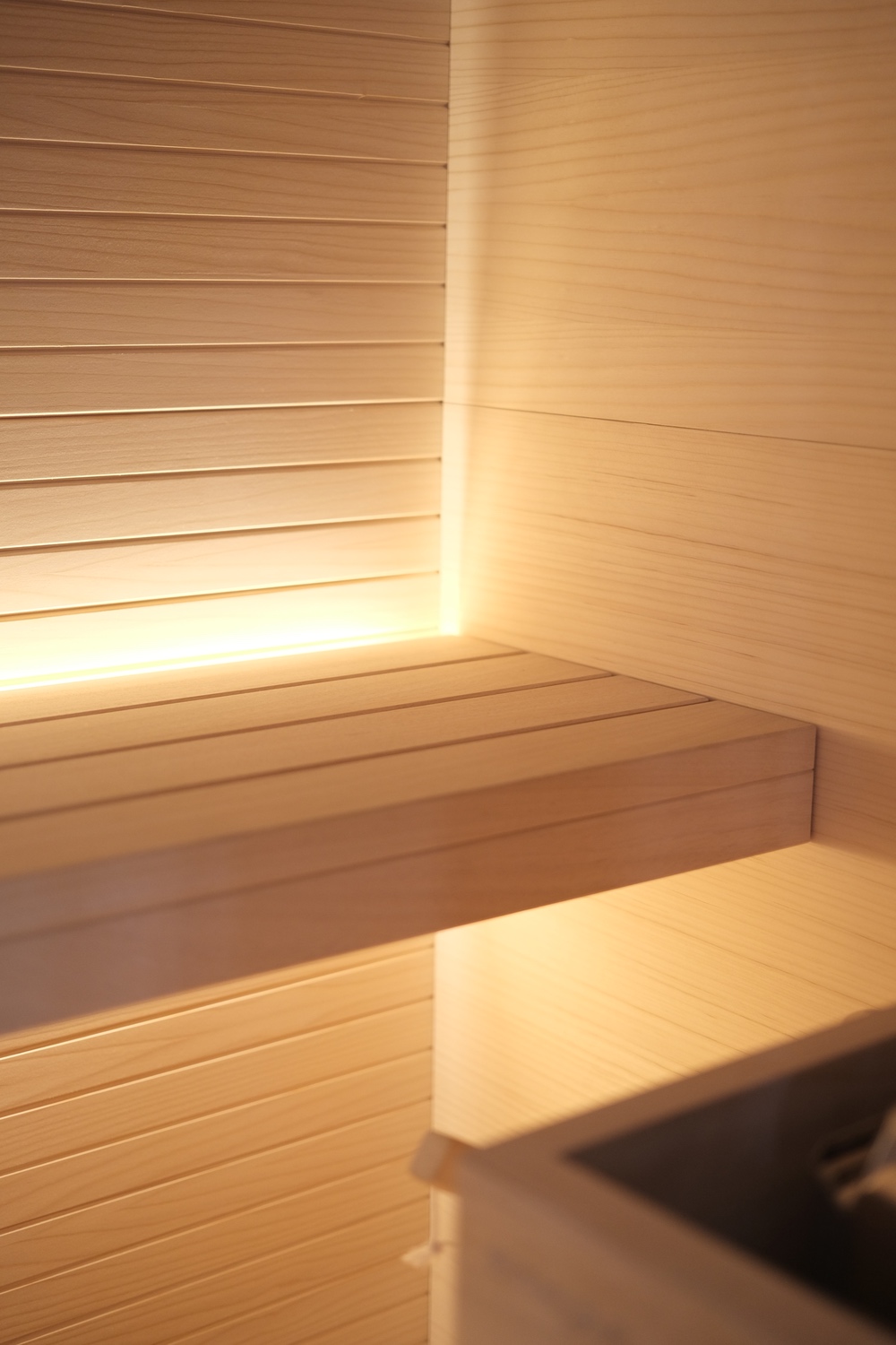 Progettata in uno spazio ridotto, questa sauna compatta dimostra che non è necessario disporre di grandi ambienti per godere dei benefici di una sauna privata. Con il suo design essenziale e moderno, si inserisce armoniosamente nella stanza, occupando una porzione della parete senza risultare ingombrante.