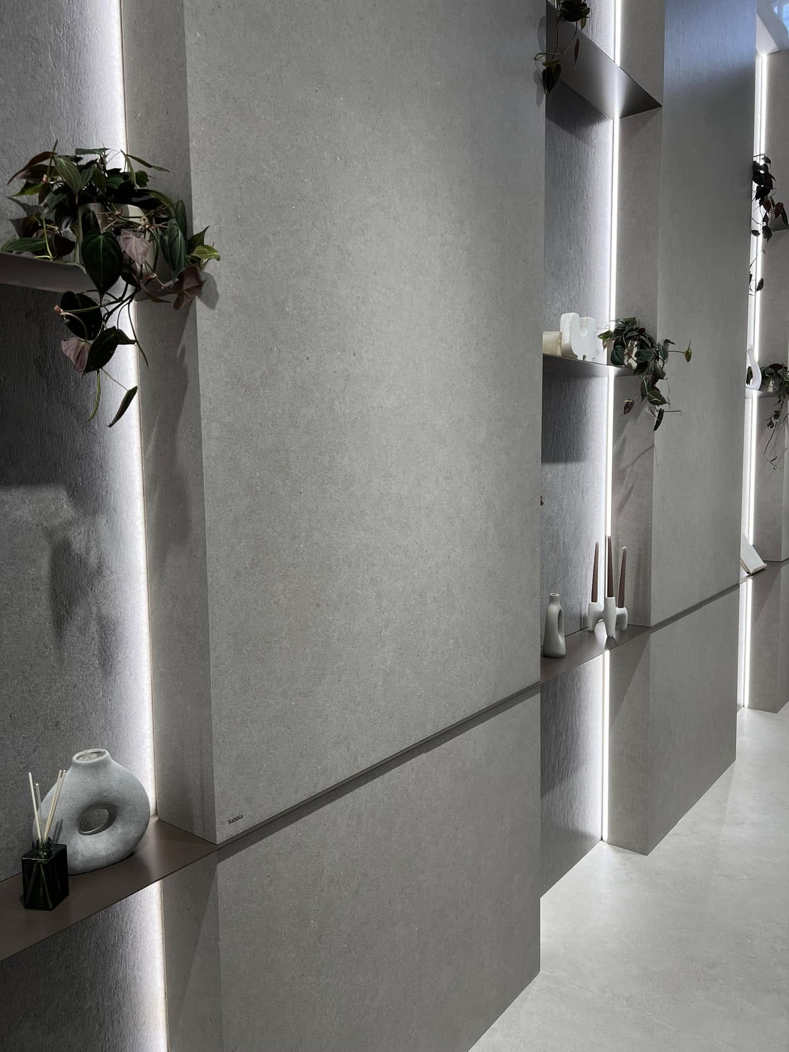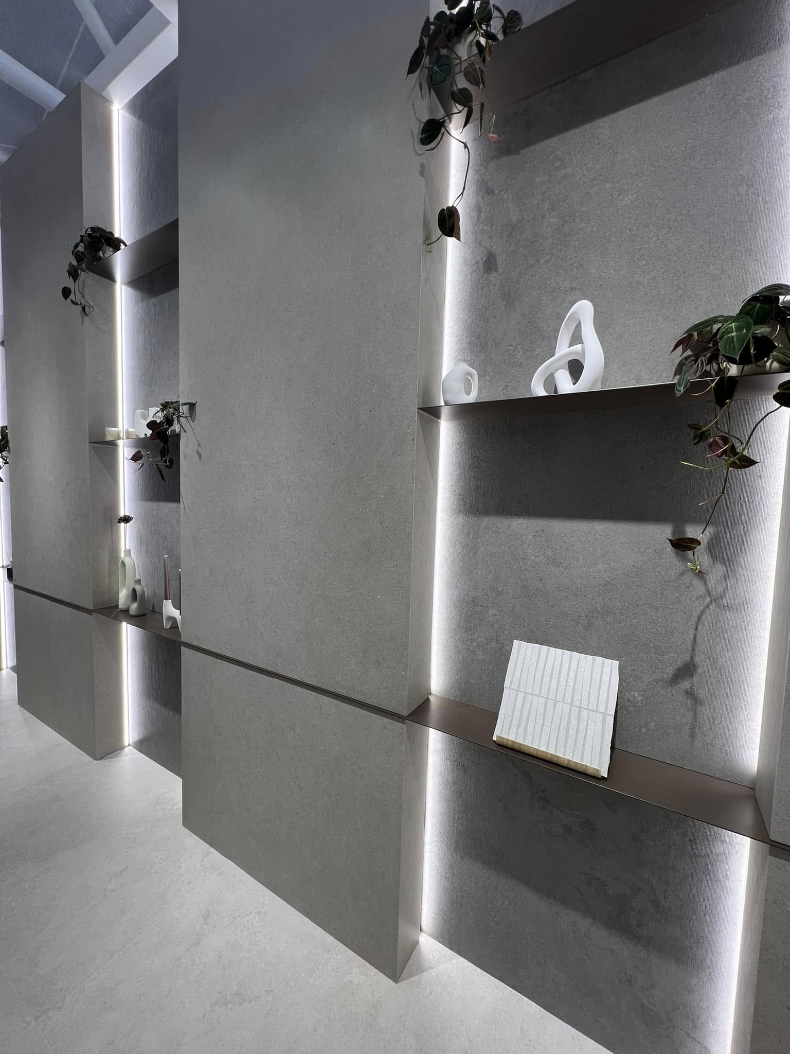 Parete rivestita con grandi lastre in grès, illuminate con led a luce radente incassate su cartongesso e su cui sono state sovrapposte delle mensole.