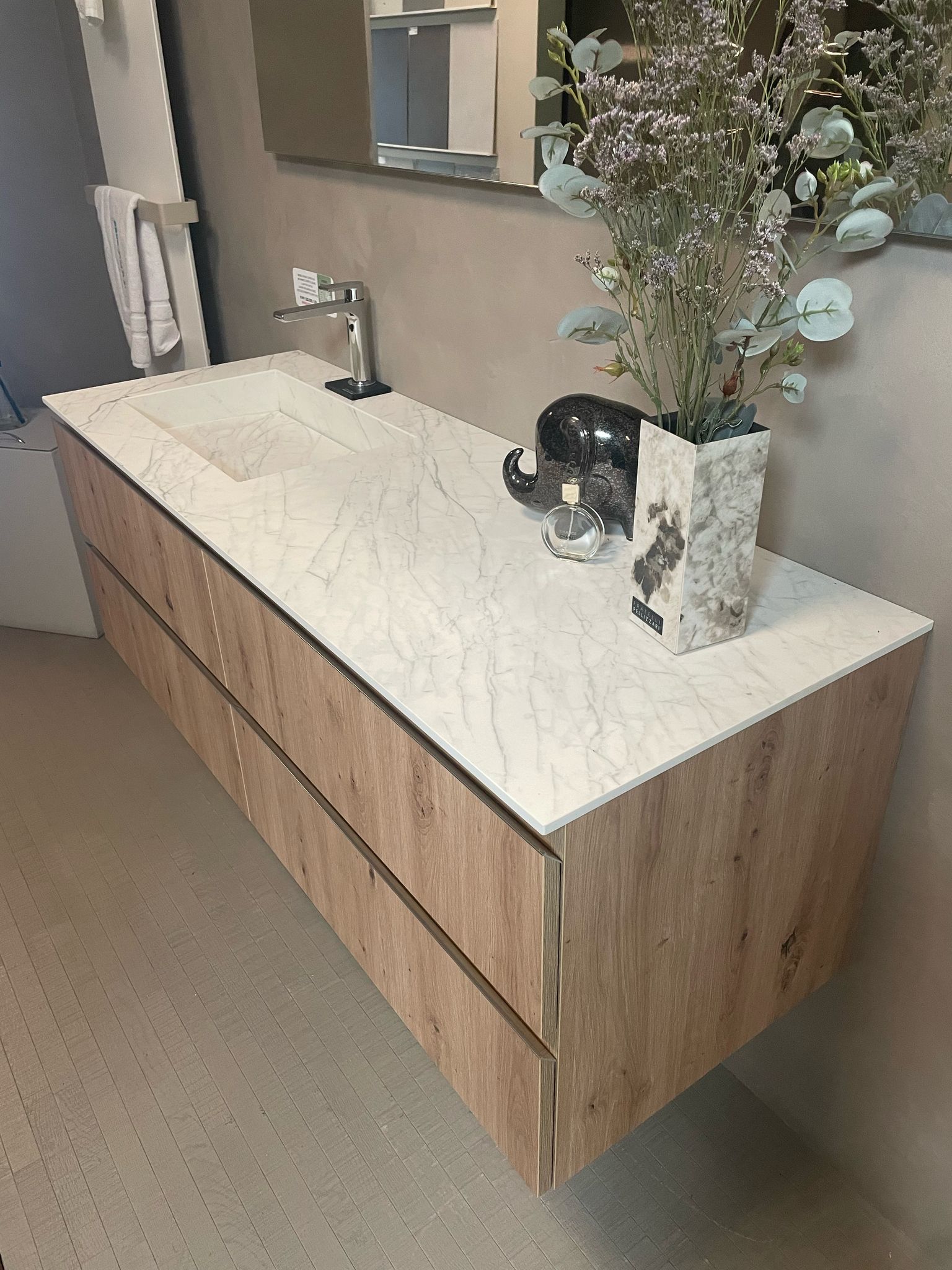 piano con lavabo integrato in gres porcellanato effetto marmo