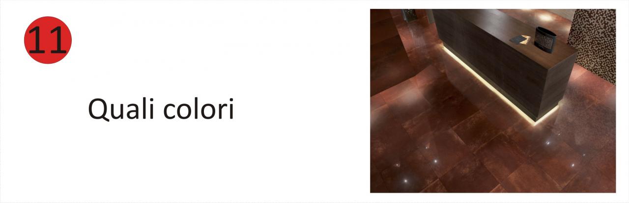 Per un locale giovane e dinamico si possono scegliere degli effetti metallici che, solitamente, non son uniformi e garantiscono una certa lucentezza alla piastrella che aiuta a rendere meno evidente la presenza di liquido o gli aloni. Un effetto copper (rame invecchiato) o un effetto corten (metallo arrugginito) sono ottimi sia come pavimento che come rivestimento.