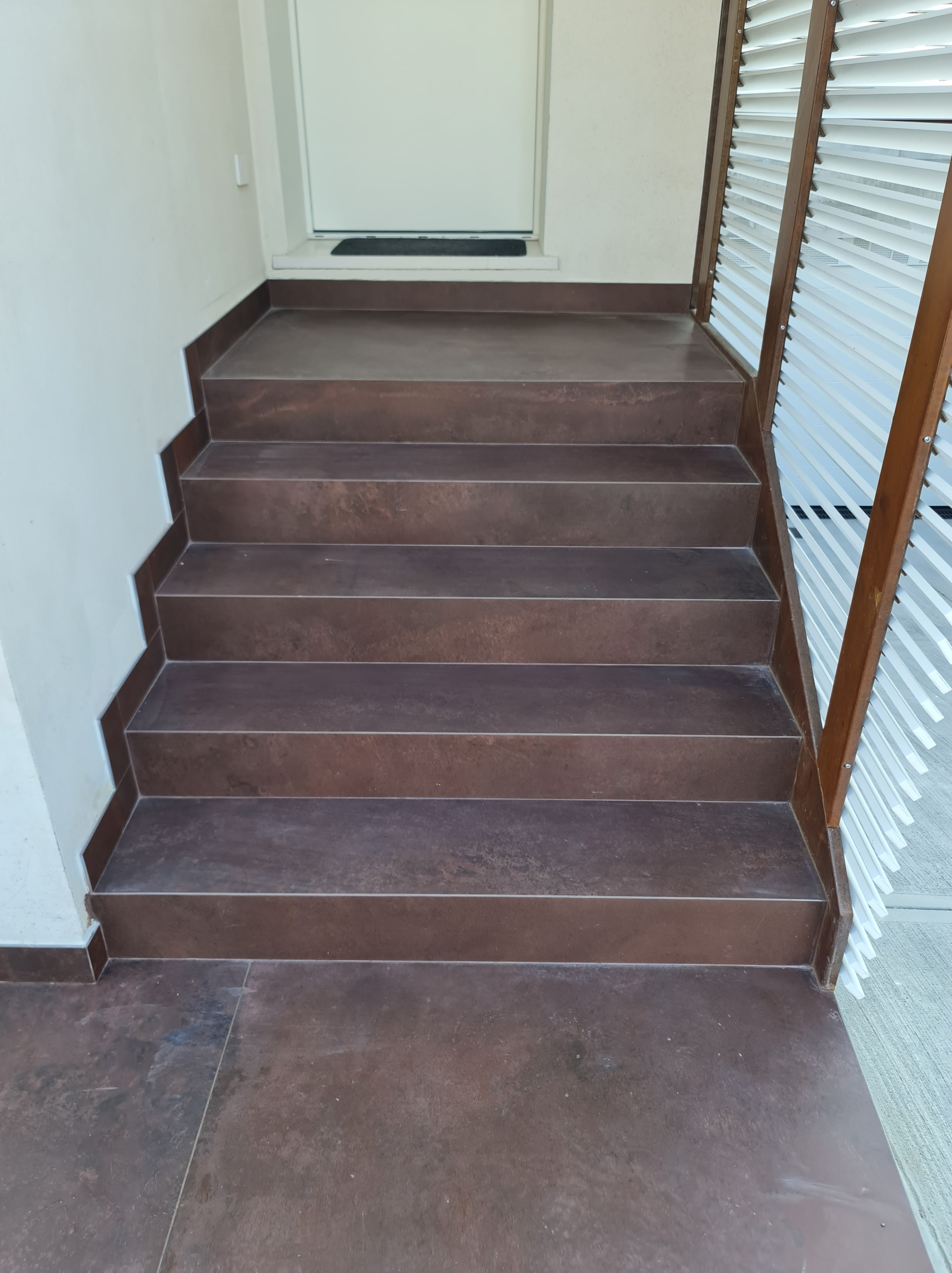 Dopo qualche passo arriviamo alla scala d'ingresso in cui abbiamo pensato di utilizzare la dimensione più grande della stessa piastrella, 120x240 cm, in modo da creare degli scalini monolitici che non abbiano nessuna fuga che rovinerebbe l'estetica e darebbe più difficoltà durante la pulizia.