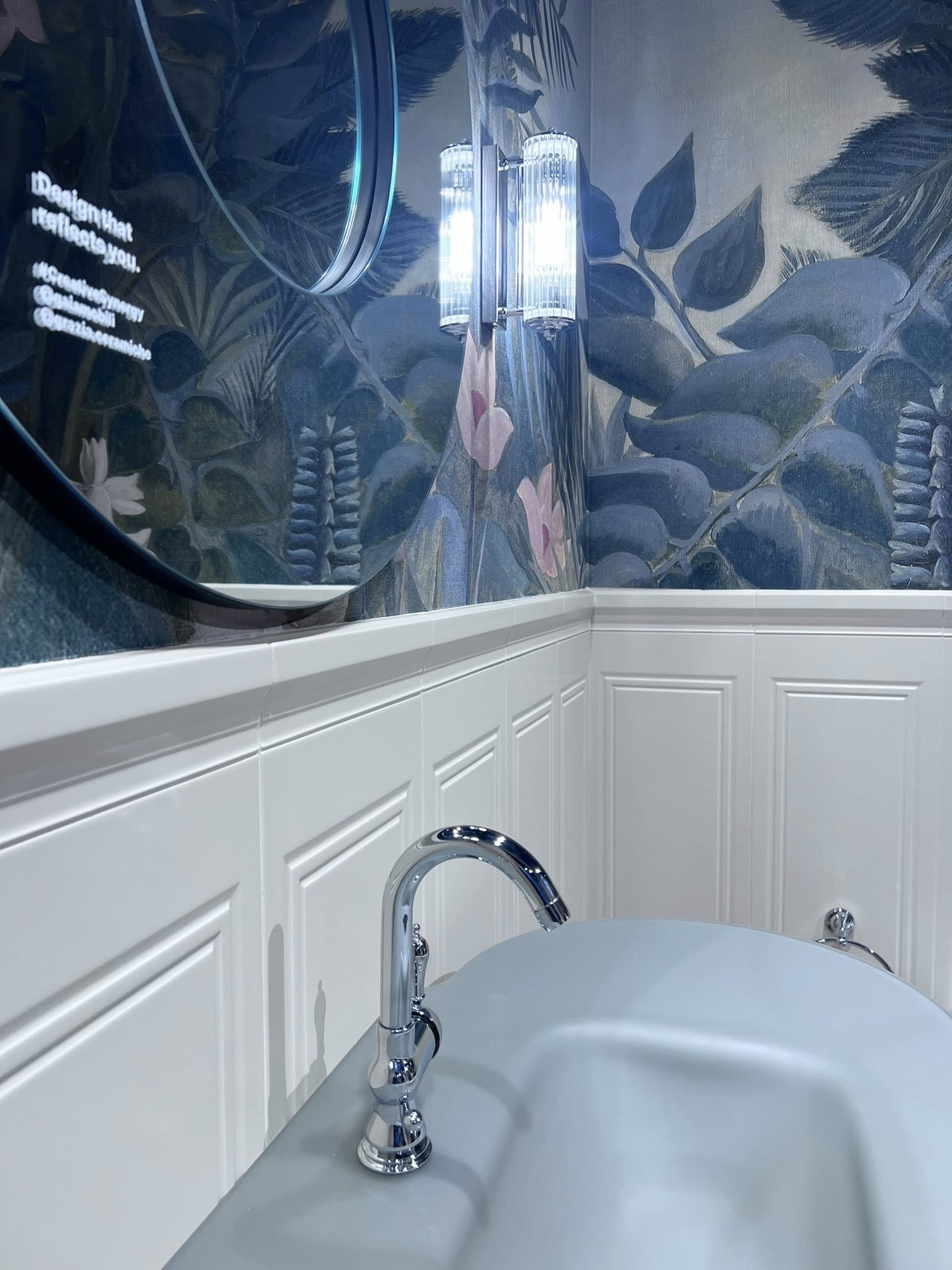 Boiserie bagno in ceramica e carta da parati