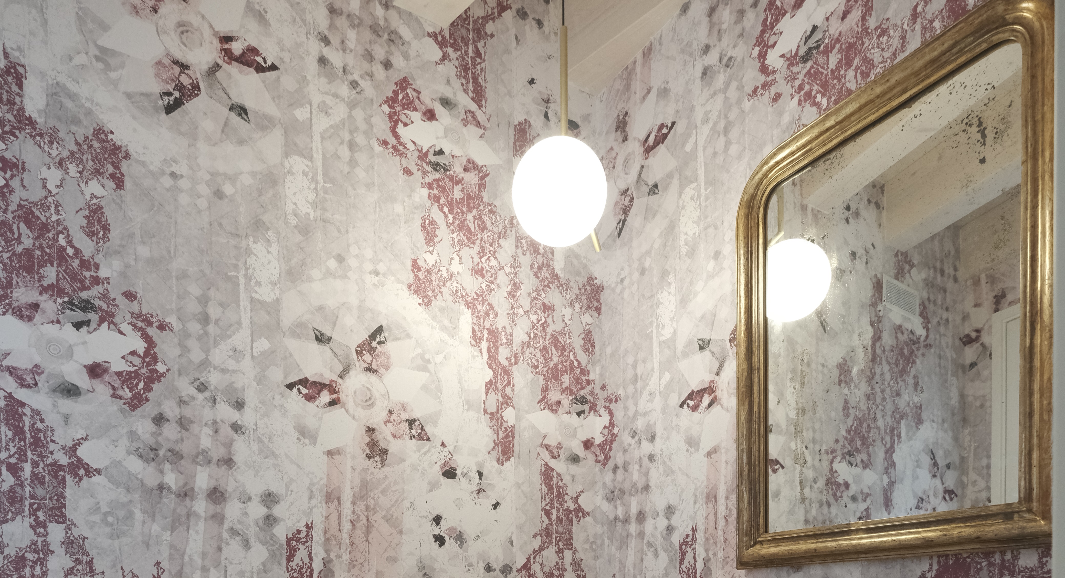 La posizione strategica della lastra permette un gioco di riflessi che amplifica la sua presenza: di fronte alla doccia, sulla parete opposta, uno specchio di grandi dimensioni riflette l’immagine di Banksy, raddoppiandone l’effetto e creando una connessione visiva tra le due aree del bagno. Questo specchio non solo rende lo spazio più luminoso e arioso, ma trasforma il dipinto in un elemento dinamico, che si muove con chi lo osserva, regalando una prospettiva sempre nuova.