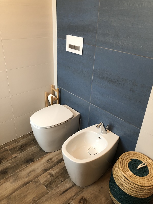 In questa ristrutturazione a Montecchio Maggiore il bagno è stato dipinto con una pittura lavabile dalla tonalità del Classic Blue.