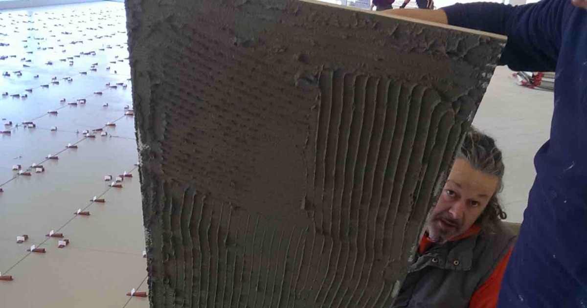 In questo ufficio ad Arzignano (Vicenza) stiamo sovrapponendo al pavimento esistente un grès di grande formato: 120x120. Dopo aver applicato un promotore di adesione sul fondo la piastrella viene applicata con il metodo della doppia spalmatura e con i cunei livellatori.
