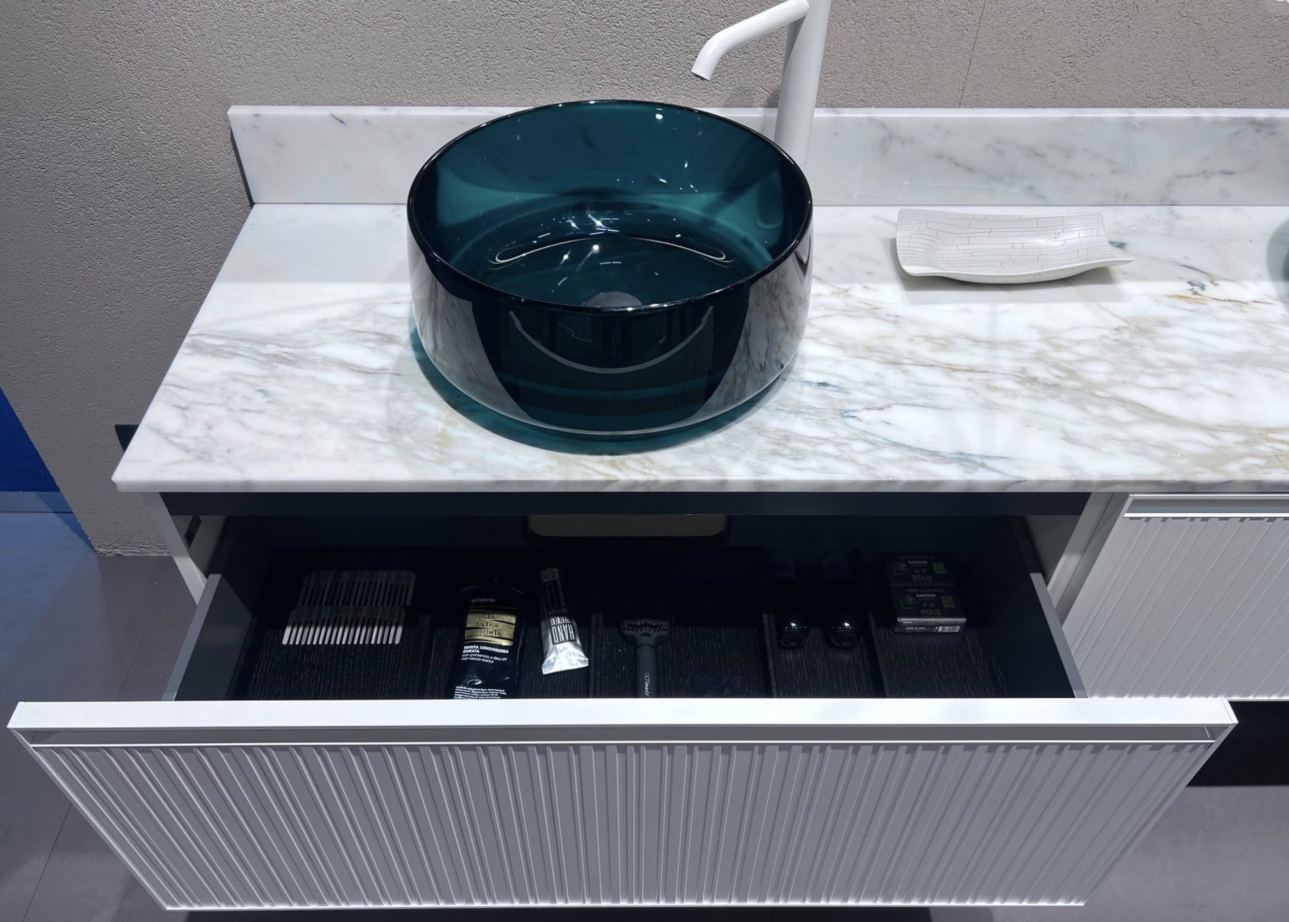 Un dettaglio importante riguarda il sifone, che in questa configurazione rimane a vista: un elemento tecnico che può diventare anch’esso parte del progetto estetico, scegliendo modelli dal design curato in finitura cromata, nera o coordinata con la rubinetteria.