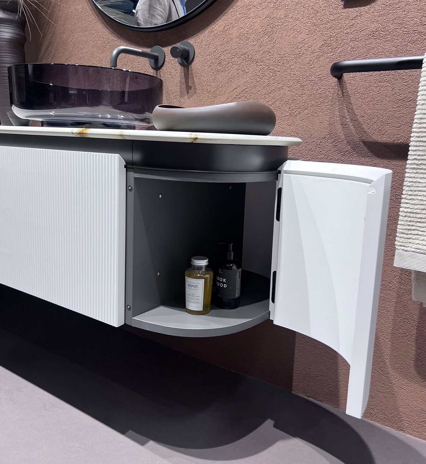 Mobile bagno sfalsato in laccatura bianca e gres effetto metallo nero