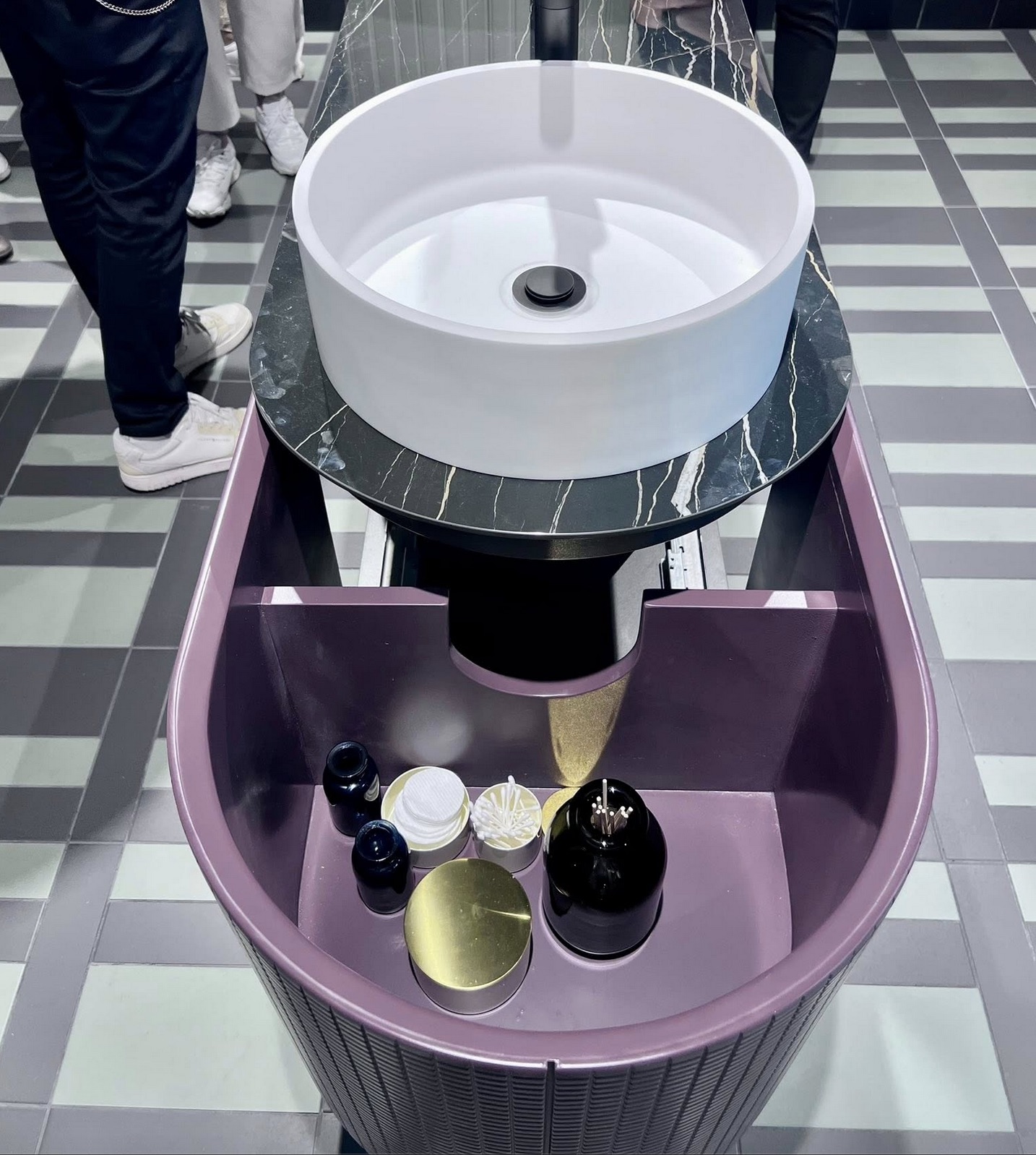Integrata al lavabo: forma un tutt’uno con la zona lavabo, creando un piano funzionale e continuo.