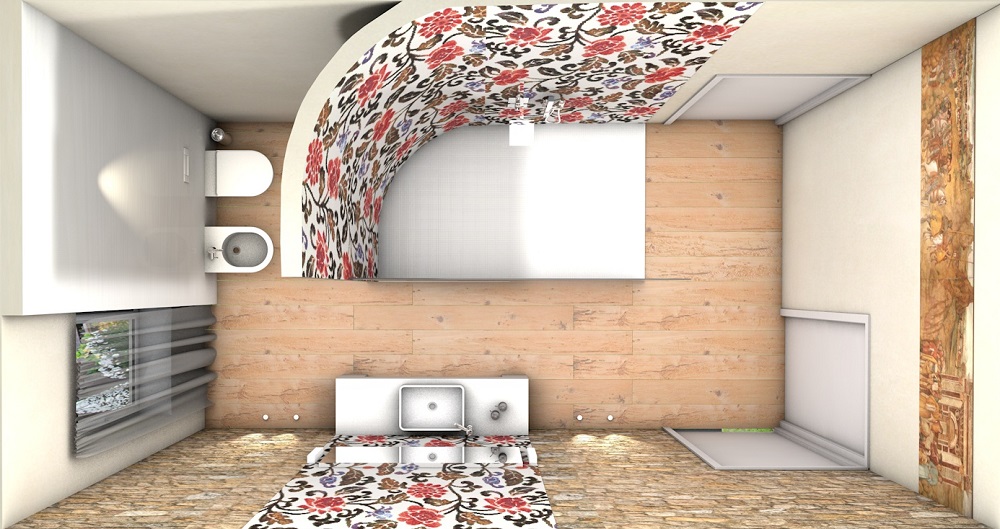 Dopo ulteriori riflessioni e dopo aver studiato in loco la situazione, abbiamo ipotizzato alcune soluzioni fino ad arrivare a condividere tra tutti i protagonisti di questo lavoro, quella che sembrava calzare meglio con le esigenze. Abbiamo realizzato un progetto in 3D fotorealistico seguendo le indicazioni del progettista per consentire alla committente di esaminare l'aspetto che avrebbe avuta la parete tonda e poi la stessa rivestita.