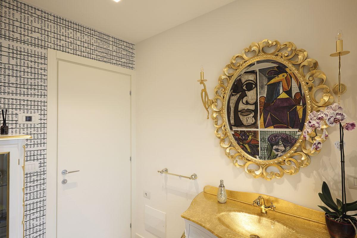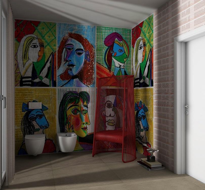 La cosa più sorprendente di questa abitazione è un bagno che ho progettato cercando di accontentare una richiesta del cliente che, amante dell'arte, voleva riprodurre alcuni quadri nel rivestimento del bagno.