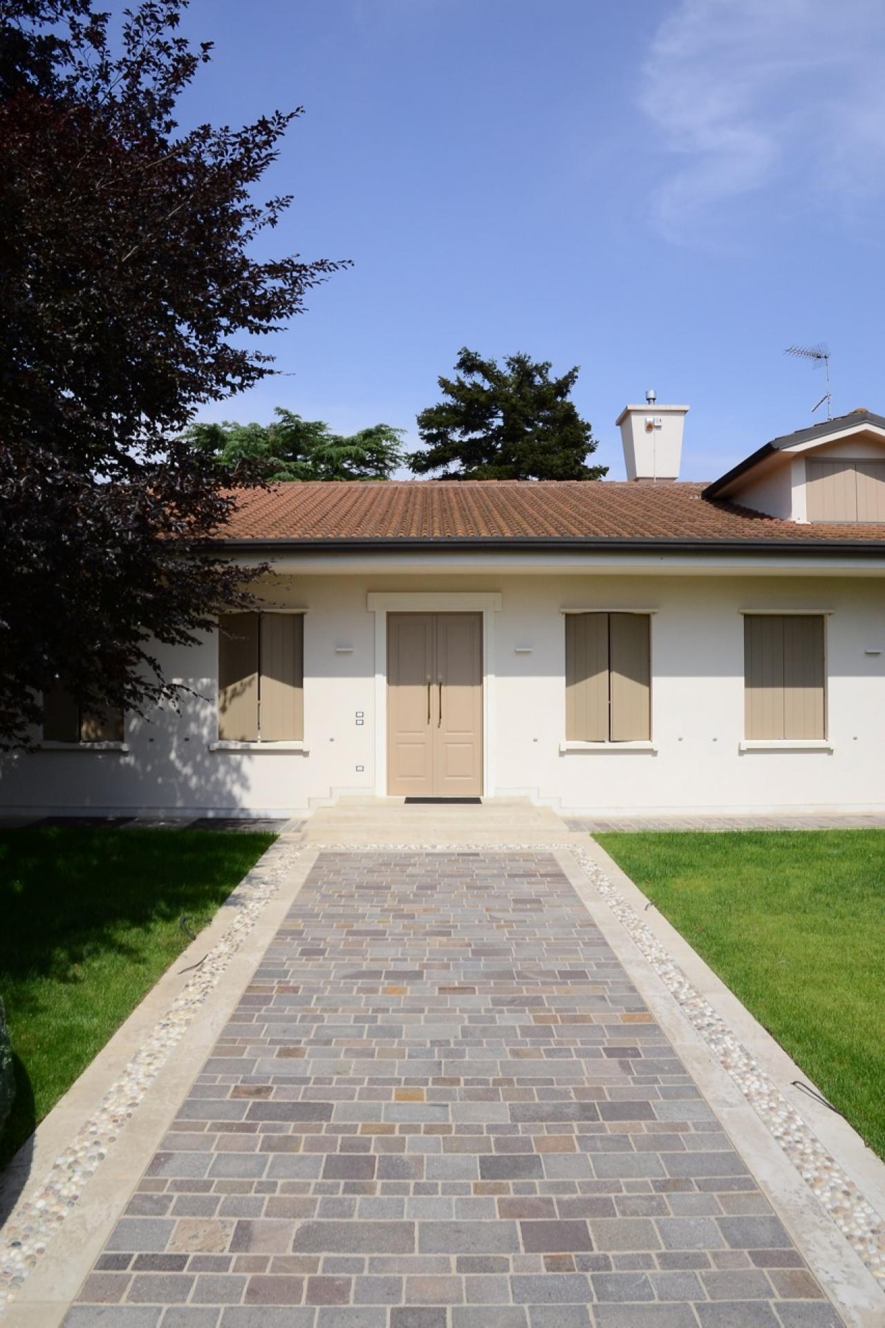 Oltre al grande viale dobbiamo pensare ai marciapiedi ed al vialetto che consente l'accesso pedonale anche dal retro della casa. Ma in questo caso il cliente ci invita a pensare ad una soluzione molto semplice e lineare.