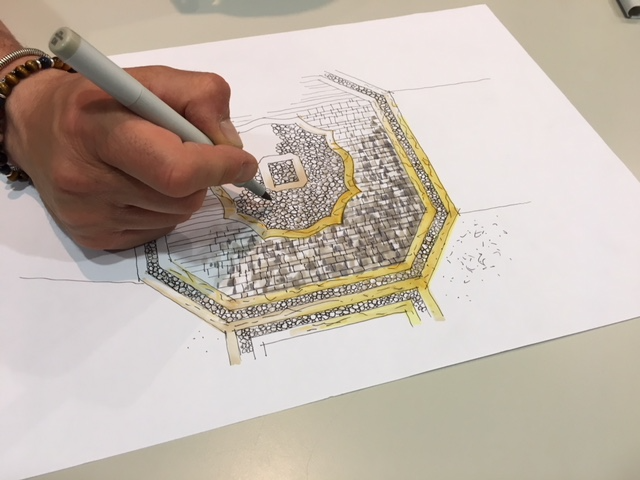 Lui e la moglie amano l'architettura neoclassica e, ci dicono, vorrebbero collezionare in giardino sculture che il pavimento dovrà valorizzare. Iniziamo ad ipotizzare alcune decorazioni del grande viale pedonale di accesso.