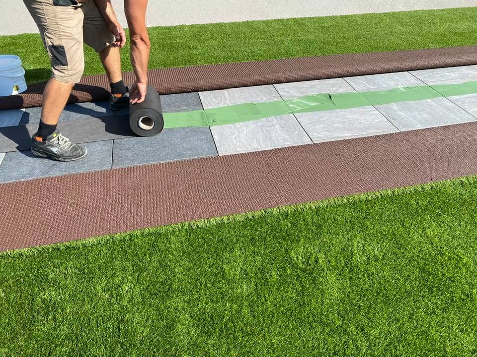 Dal momento che non poteva essere incollata direttamente sulla membrana impermeabilizzante del tetto, abbiamo ideato una soluzione interessante: posare una pavimentazione galleggiante, sempre in grès porcellanato di alto spessore, su cui abbiamo poi steso il manto erboso.