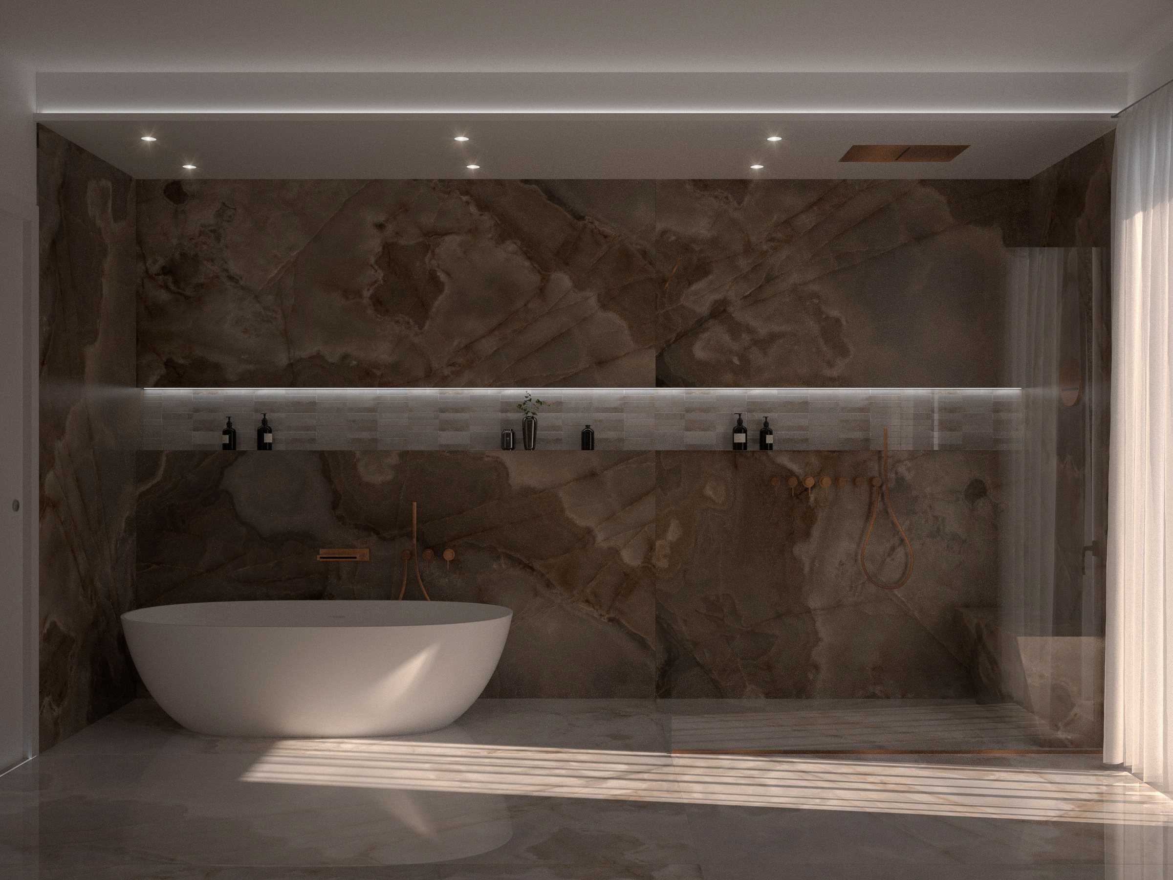 Questo bagno padronale si distingue per la sua atmosfera avvolgente, dove la parete in gres effetto alabastro choco crea un contrasto sofisticato evidenziando le forme morbide dei catini e della vasca freestanding. La composizione del lavabo doppio, con il suo mobile in legno scuro sospeso e la rubinetteria ad effetto rame, è definito da uno specchio ampio che amplifica la profondità dello spazio. La doccia walk-in, con un box in cristallo trasparente che lascia a vista le grandi lastre effetto alabastro, definisce un'area funzionale senza interrompere la continuità visiva.