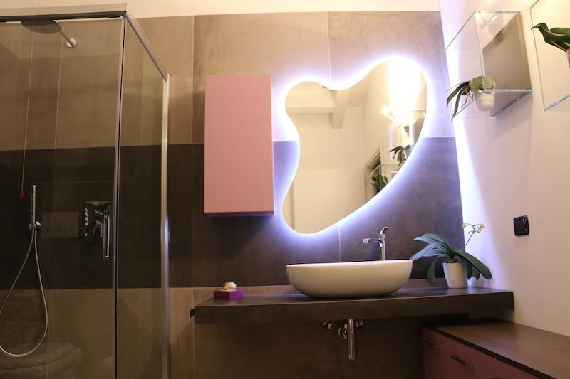 Lo specchio è stato rimontato e ho fatto fare, sempre dal nostro artigiano, un pensile a colore Ral per riprendere lo stesso colore del mobile contenitore esistente sotto al piano, anche questo mantenuto e rimontato.