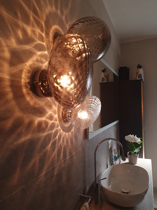 Il tocco di carattere e d'eleganza è dato senza ombra di dubbio dalle 3 applique in vetro soffiato di Murano che abbiamo posizionato a lato dello specchio. Le luci che hanno una superficie in vetro molto lavorata creano sulla parete dei giochi di luci particolari ed eleganti. Anche nel vetro abbiamo ripreso il tono del fumè che rende l'ambiente accogliente e caldo allo stesso tempo.