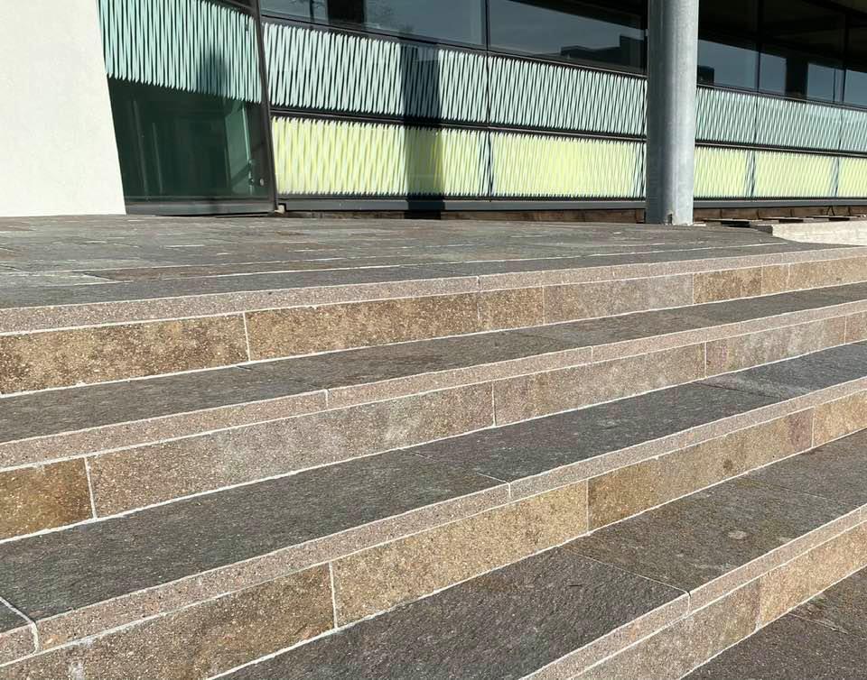 Ci sono diversi modi: la scala può essere realizzata usando pezzature più piccole per formare i gradini (per esempio 10x10) con delle alzate che fanno da contenimento. Oppure possiamo realizzare scale tagliando le lastre di porfido sagomate in base alle dimensioni dei gradini. La prima soluzione è più economica e garantisce un costo di gran lunga inferiore rispetto alla seconda, con i gradini realizzati tagliando le lastre.