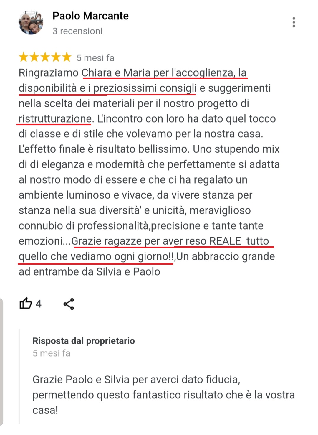 The final verdict of a customer never comes in person, but comes online, after he has left the shop after a purchase and lived in the converted house for some time. It is the customer who bears witness to the success or otherwise of a job and whether the designer has that "something" that made them enthusiastic. Here are some reviews that clients who have worked with Maria have written about her: