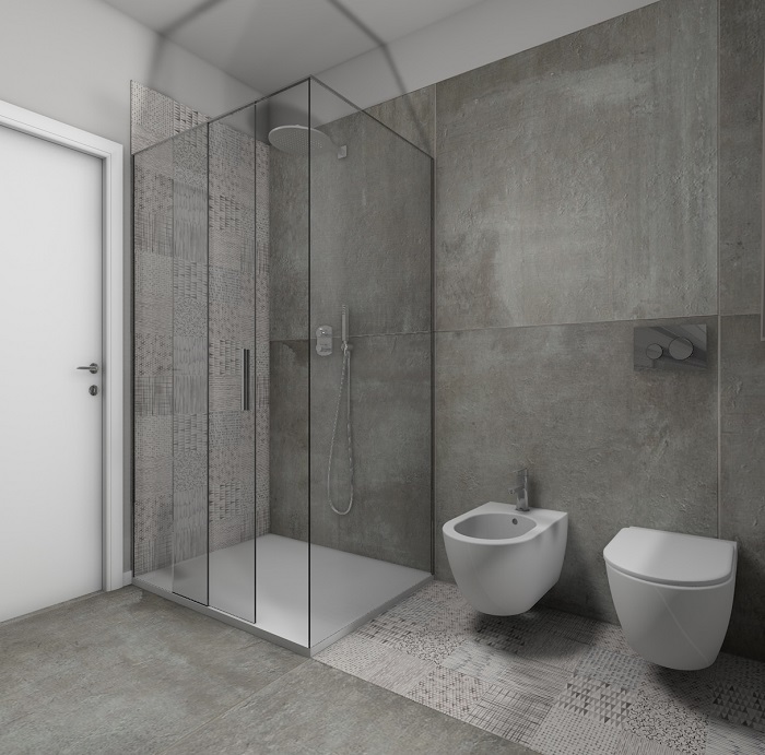 A portion of the floor, the inside of the shower and the wall of the cabinet are being covered with cement effect stoneware tiles. As the product is rectified, we have laid it using progress profiles screw levellers.