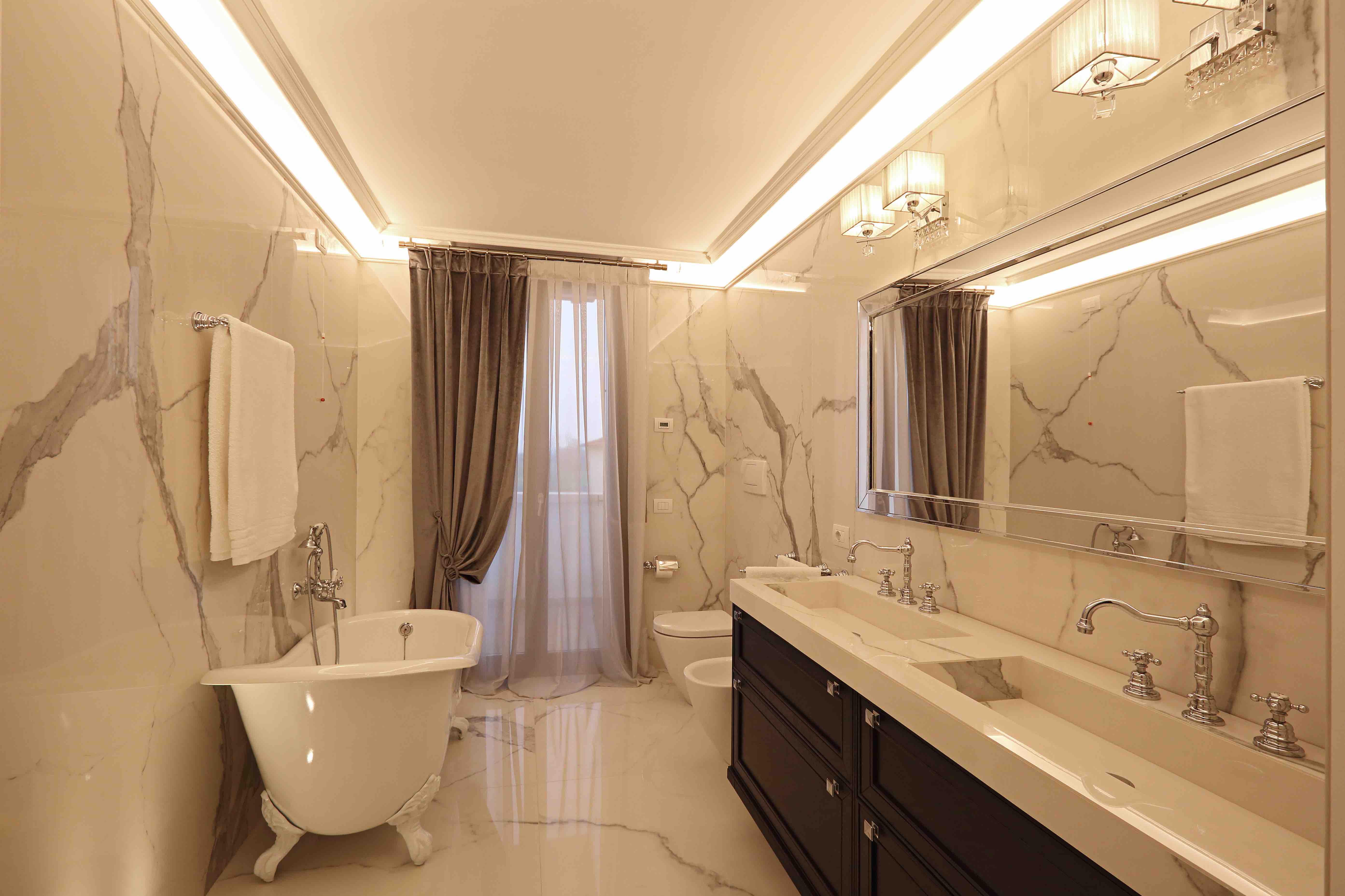 One of the things we always do when designing marble-effect bathrooms in particular is to insert a possibly illuminated niche.