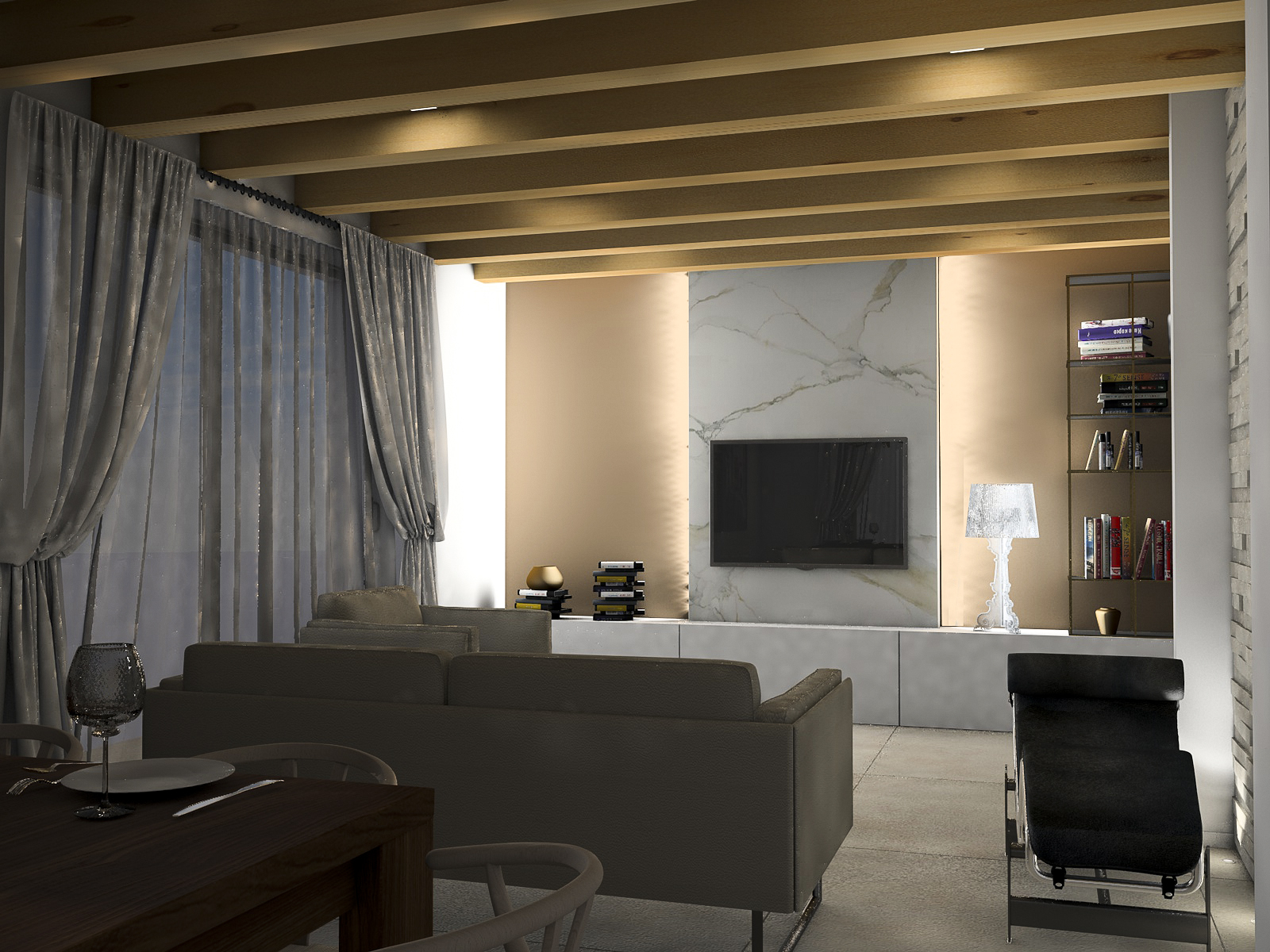 Come si vede dai renders qui sotto lo spazio living della zona giorno vedrà come protagonista una grande lastra in grès effetto marmo.