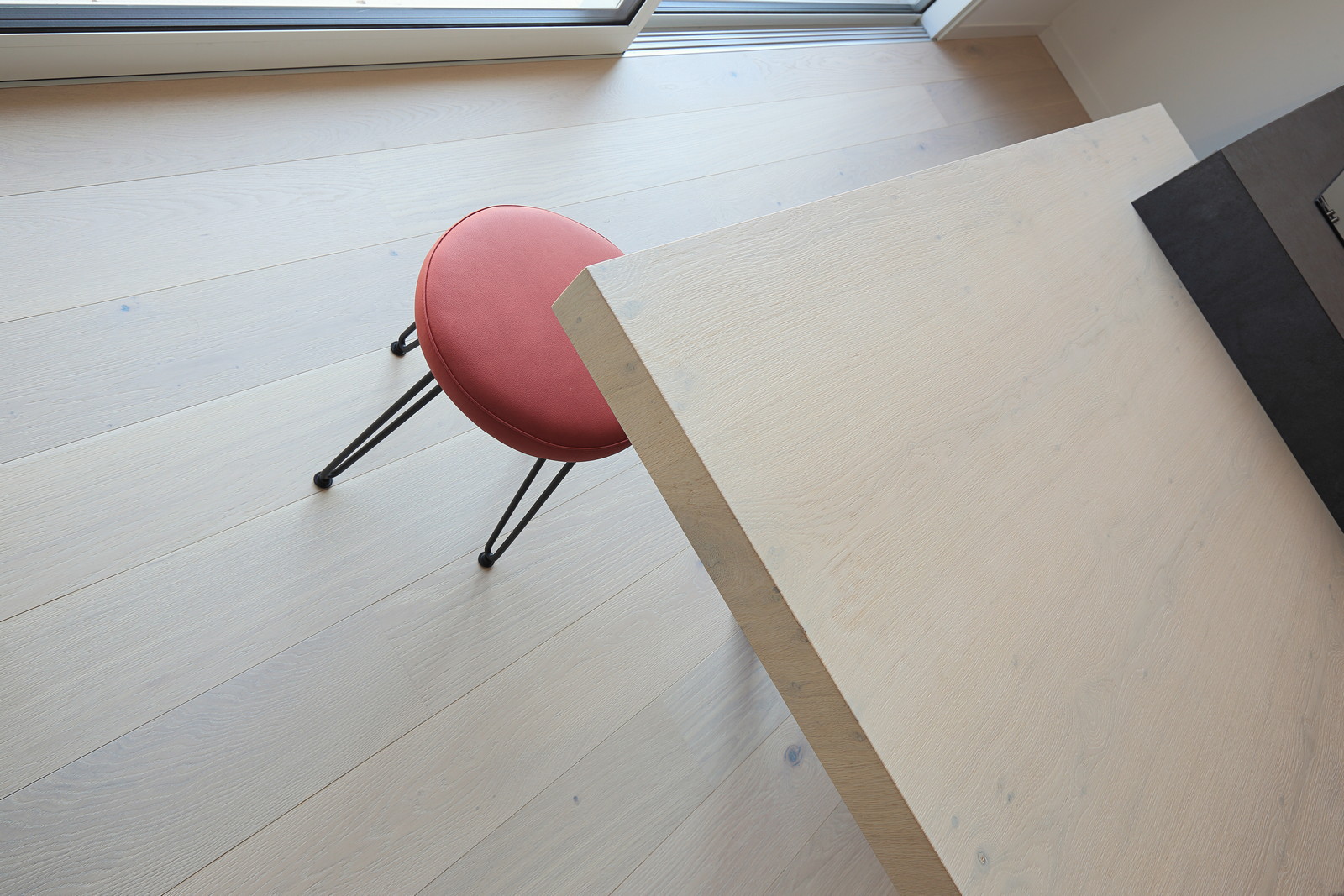 Pavimento in legno di rovere naturale molto nodato, che pavimenta l'intera abitazione e coinvolge elementi d'arredi. Clicca e scopri di più.
