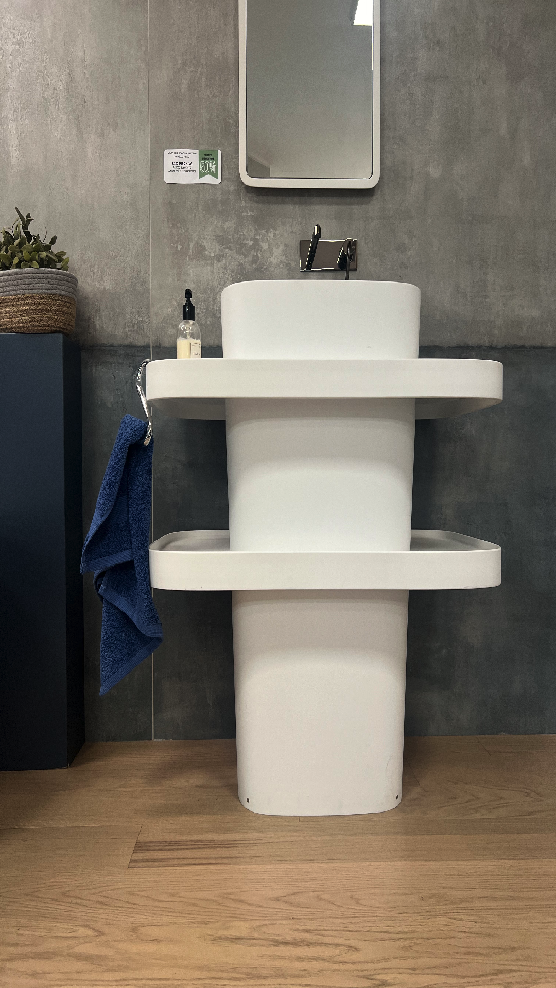Mobile sospeso con texture in legno grigio e piano in gres