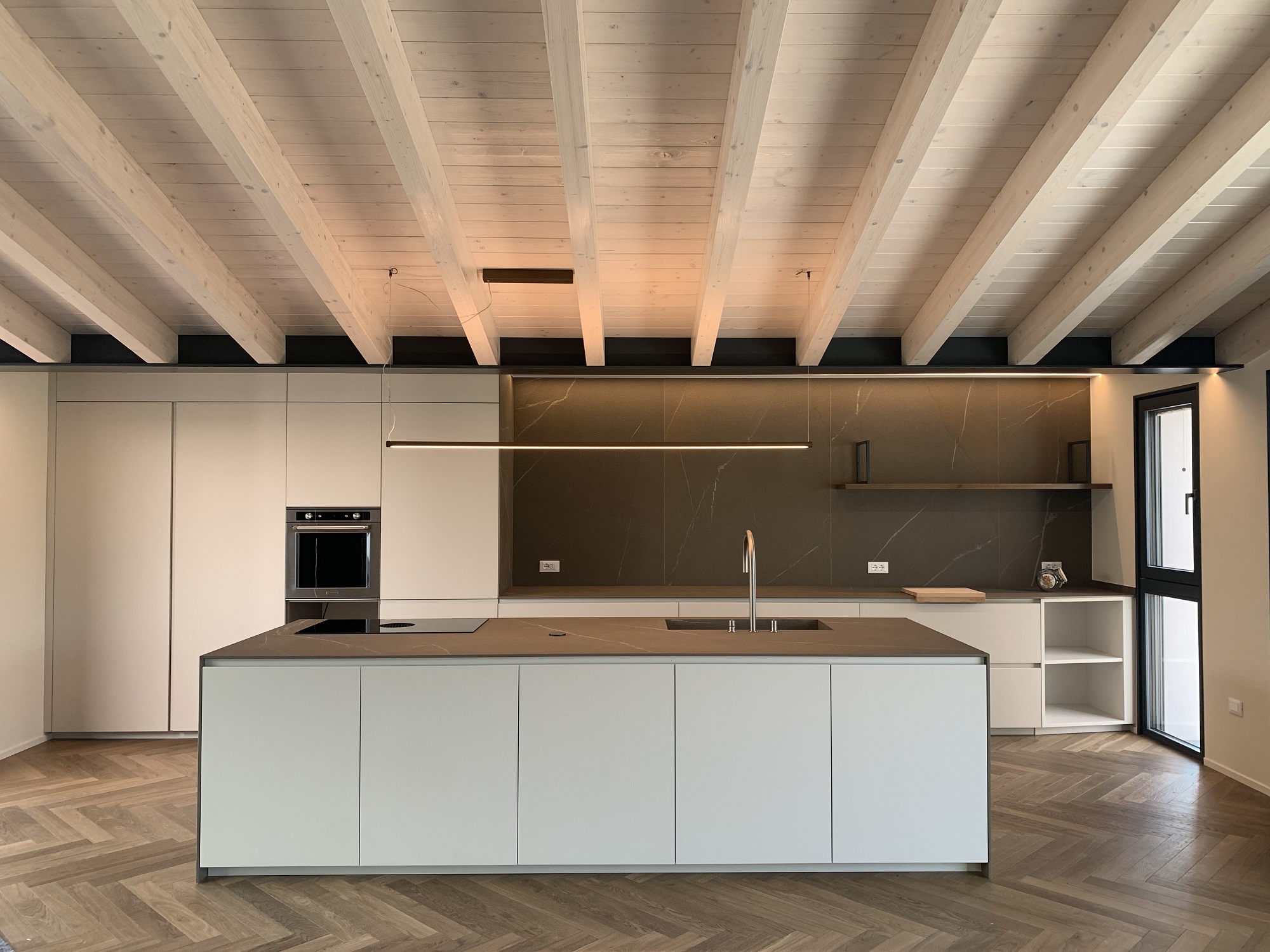 Piani, frontale e fianchi in grès ad alto spessore per questa cucina installata in un attico a Vicenza. Il piano in grès, oltre all'estetica, garantisce una resistenza al graffio, alle macchie, al calore ed una durata pressoché eterna. Il tavolo per la colazione, che si appoggia all'isola, è stato realizzato con lo stesso legno del pavimento: un rovere a spina ungherese anticato. Abbiamo realizzato tutto in questo attico: dai massetti ai pavimenti, all'arredamento totale. Tra le cucine fotografate e messe nei nostri social, questa è la più "amata".