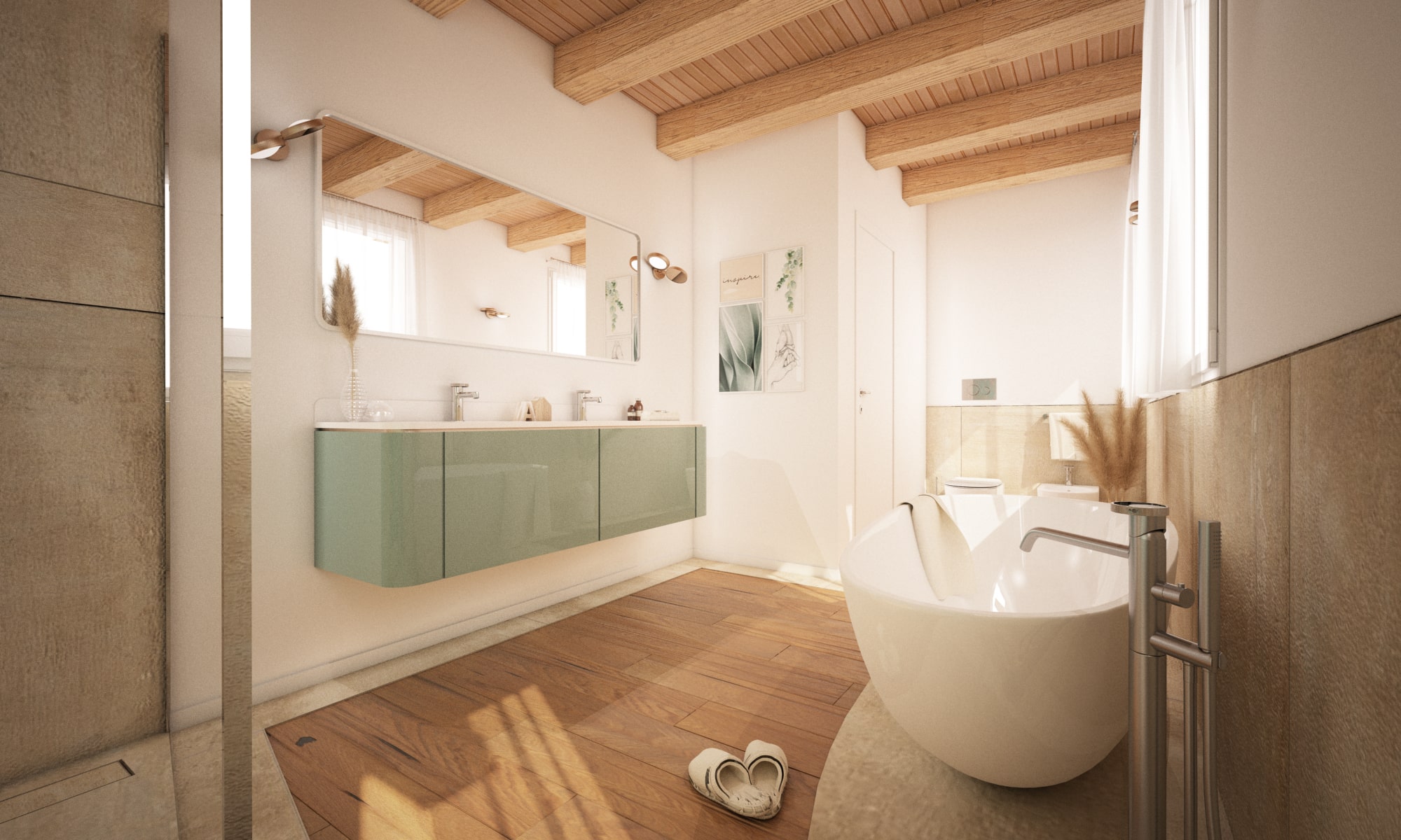 Quando il bagno è all'interno della camera padronale si parla di bagno en suite. In queto potremmo entrare con lo stesso pavimento delle camere, quindi magari con il parquet, e terremo conto che è il bagno principale, che utilizzi al mattino per prepararti ad uscire. Qui dovremo trovare il modo di dimensionare spazi capienti, accoglienti e ben illuminati. Se possibile inseriremo un mobile bagno con doppio lavabo.
