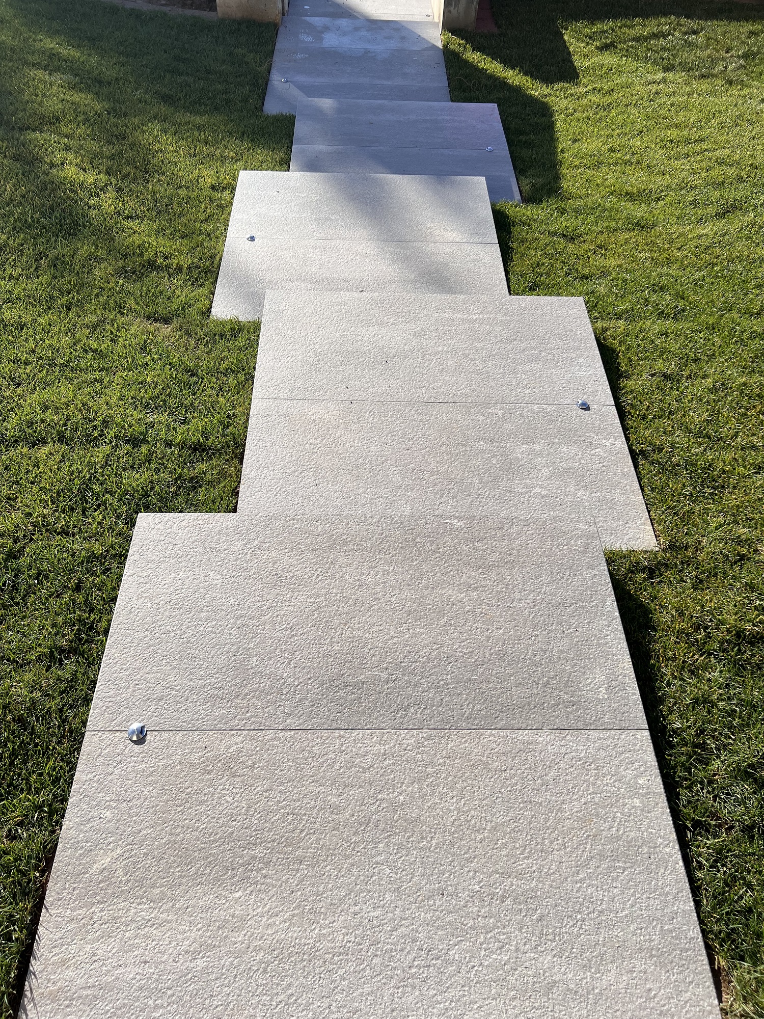 Vialetti pedonali nel giardino di casa pavimentati in gres porcellanato effetto pietra con piastrelle dal grande formato.
