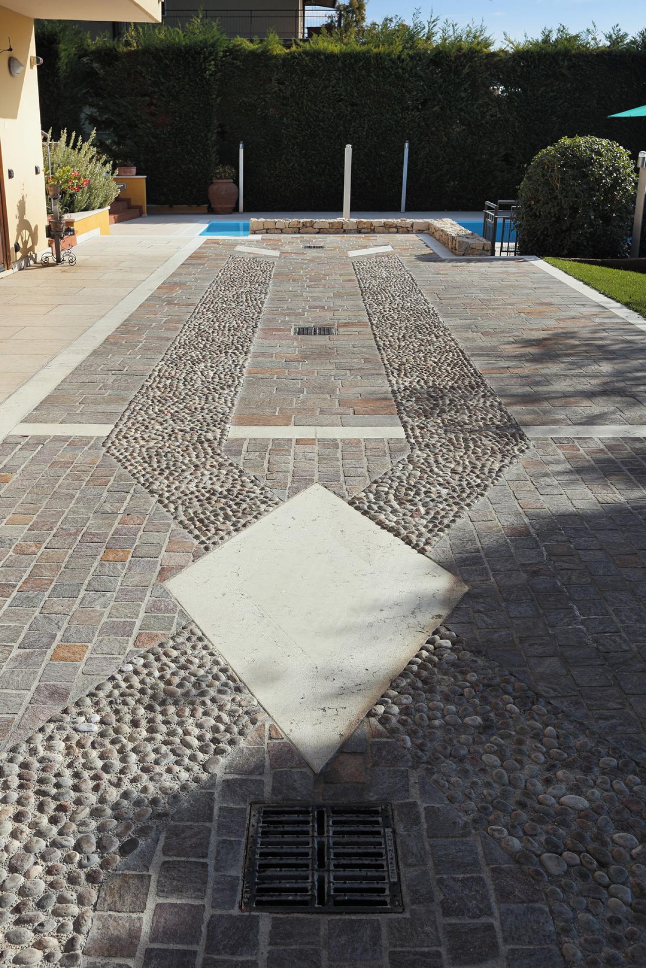 Andrea ha studiato e progettato lo spazio esterno, accostando con eleganza e raffinatezza materiali lapidei tradizionali con uno ricercato stile classico.Pietra, porfido e ciottolo per pavimentare un esterno a Verona