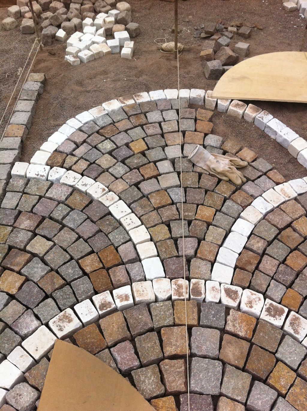 Gallery fotografica di un pavimento in porfido in corso di realizzazione a Verona: la posa del porfido a raggiera.Vialetto esterno in porfido a cubetti, Vicenza