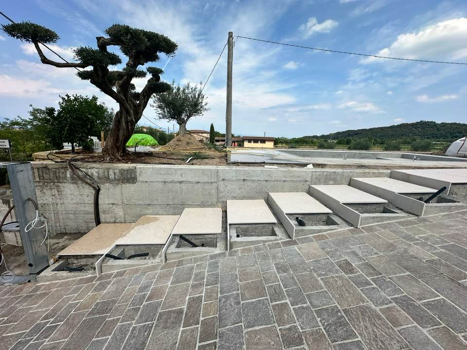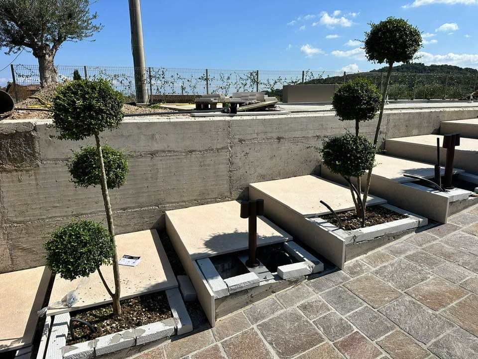 In questa abitazione abbiamo realizzato le pavimentazioni esterne e questa doppia scala che porta dal piano strada al piano rialzato di accesso ai due edifici. Dopo i primi tre gradini diritti i due viali si separano formando due curve che accolgono, al loro interno, una aiuola. Qui trovi tutto su questo intervento: