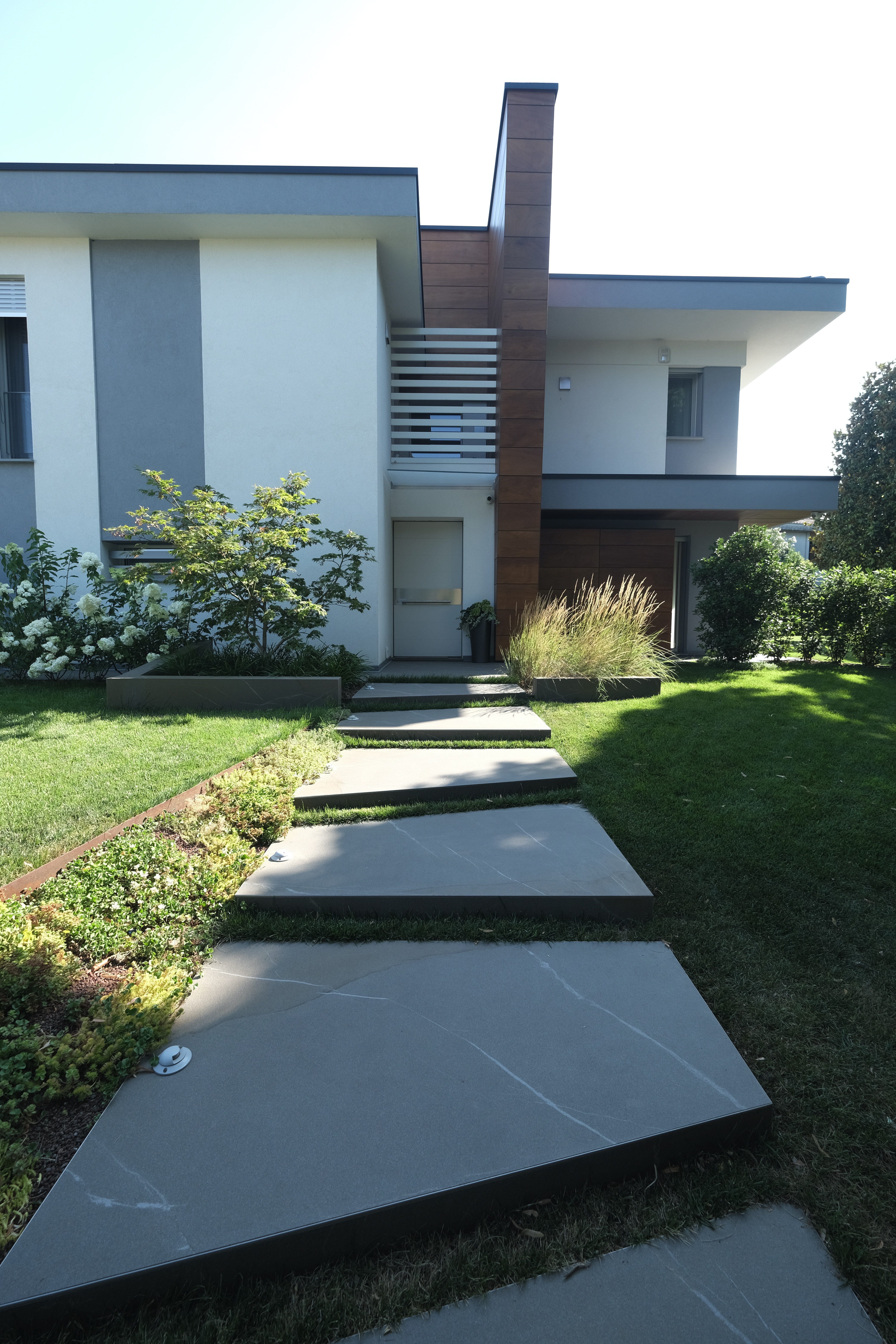 Scala in gres effetto pietra piasentina in grandi lastre all'ingresso di questo esterno ben curato che richiedeva un materiale pratico ma che ben si adattasse alla vegetazione circostante.